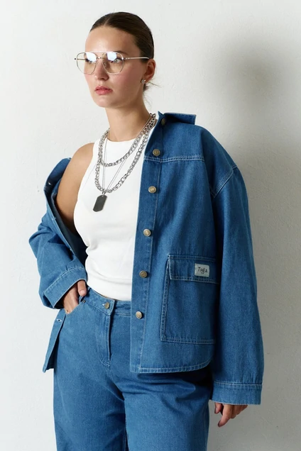 Жакет рубашка прямого силуэта из джинсовой ткани с вываренным эффектом в трендовом стиле рабочей одежды. перед и спинка с кокеткой. по переду накладные карманы с клапаном с лейбой с названием бренда. спинка с кокеткой. Рукава на спущенной пройме с манжетой по низу. Фигурная линия низа. акцент - воротник и внутренная кокетка спинки из бежевого плотного денима. Контрасные отделочные строчки по швам выполнены из хб нитки для джинса. Застежка на металлические болты.