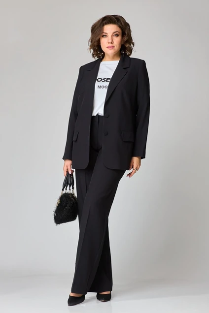 Жакет прямого силуэта с намеком на полуприлегание, с застежкой на две петли и две пуговицы. Перед жакета с рельефами, нагрудными вытачками и прорезными карманами с клапаном. Спинка жакета со средним швом. Длина жакета - до середины бедра. Рукава двухшовные втачные. Горловина оформлена воротником пиджачного типа. Чёрный жакет отлично будет смотреться как с формальными, так и с более повседневными комплектами одежды.