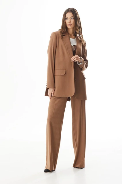 Жакет прямого силуэта. Застежка на петли и пуговицы. Воротник пиджачного типа. На переде карманы с клапаном.  По низу спинки высокие шлицы. Рукав прямой двухшовный со шлицей и пуговицами. Жакет на подкладке. Рукав Жакет прямого силуэта. Застежка на петли и пуговицы. Воротник пиджачного типа. На переде карманы с клапаном.  По низу спинки высокие шлицы. Рукав прямой двухшовный со шлицей и пуговицами. Жакет на подкладке. Рукав 62 см. (ширина плеча - 13 см.). Подкладки: 55 % ПЭ, 45 % вискоза