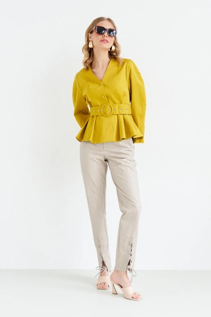Жакет женский, выполнен из хлопкового костюмного сатина, в различных цветах на подкладке. Горловина V-образной формы. Рукав втачной, спущенный, фантазийной формы, с притачными пуговицами по низу. Лиф из 2х половинок с рельефами от плеча, и застежкой на петли –пуговицы. Изделие с притачной баской и накладным поясом.