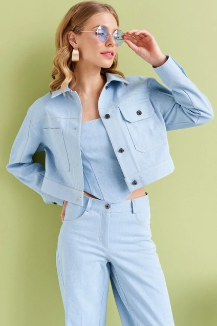 Джинсовая куртка, женская. Прямого силуэта, длиной до талии. Воротник рубашечного типа. Рукав втачной, длинный на притачной манжете, застегивающейся на петлю и пуговицу.Которая застегивается на петли и пуговицы. Перед состоит из двух частей, между которыми расположена застежка на петли и пуговицы. А также расположена отрезная горизонтальная кокетка, и ассиметричные накладные карманы. Спинка с отрезной кокеткой и хлястиком. По низу изделия идет притачной пояс.