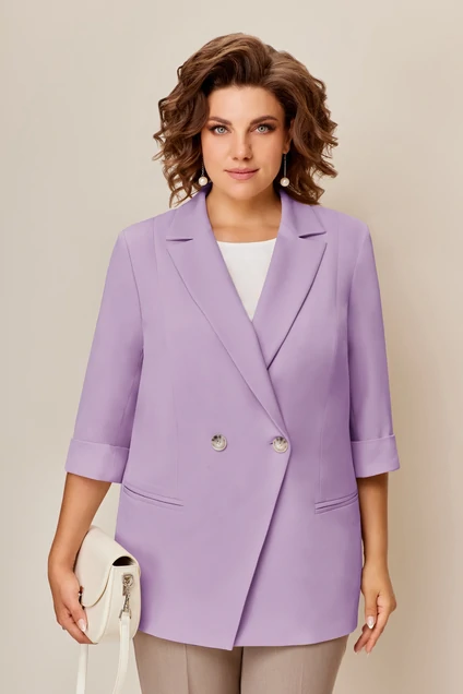 Базовый двубортный жакет полуприлегающего силуэта с застежкой на пуговицы. Полочки жакета на подкладке. Длина по спинке- 67см. Рукав втачной 3/4, с подворотом, длина рукава- 45 см.