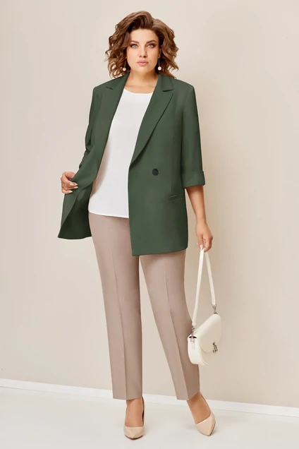 Базовый двубортный жакет полуприлегающего силуэта с застежкой на пуговицы. Полочки жакета на подкладке. Длина по спинке- 67см. Рукав втачной 3/4, с подворотом, длина рукава- 45 см.