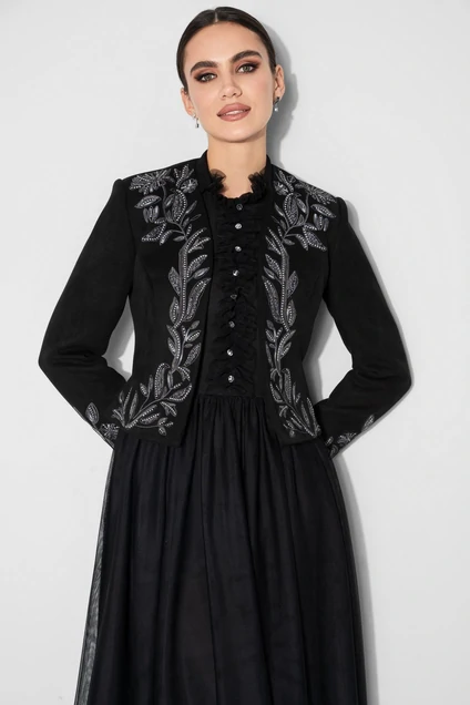 Изысканный жакет с дизайнерской вышивкой – стильный и модный предмет одежды, который прекрасно вписывается в самые разные композиции, в этом жакете вы будете в центре внимания, на любом мероприятии. Идеально дополнит Ваш образ, в комплекте с жакетом, платье 23-145-1. Жакет женский укороченный полуприлегающего силуэта, без застежки с декоративной вышивкой. Перед с рельефными фигурными швами, выходящими из проймы до бокового шва. Спинка с рельефными швами, выходящими из проймы до низа и средним швом. Рукава втачные двухшовные, длинные. Горловина фигурной формы с воротником-стойкой.