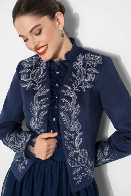 Изысканный жакет с дизайнерской вышивкой – стильный и модный предмет одежды, который прекрасно вписывается в самые разные композиции, в этом жакете вы будете в центре внимания, на любом мероприятии. Идеально дополнит Ваш образ, в комплекте с жакетом, платье 23-145-2. Жакет женский укороченный полуприлегающего силуэта, без застежки с декоративной вышивкой. Перед с рельефными фигурными швами, выходящими из проймы до бокового шва. Спинка с рельефными швами, выходящими из проймы до низа и средним швом. Рукава втачные двухшовные, длинные. Горловина фигурной формы с воротником-стойкой.