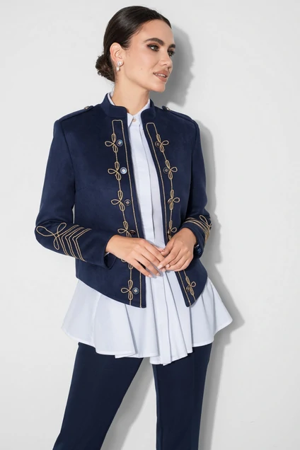 Жакет женский полуприлегающего силуэта из мягкой искусственной замши на трикотажной основе в гусарском стиле с декоративной вышивкой шнуром и шестью пуговицами, расположенными параллельно вышивке вдоль борта на левой и правой половинке, без застежки, на подкладке, с погонами, закрепленными пуговицей. Перед жакета разрезной, с нагрудными вытачками, выходящими из бокового шва. Спинка с рельефами, выходящими из проймы и средним швом. Линия низа асимметричная, спинка короче переда. По низу центральная часть переда выполнена углом. Рукава втачные двухшовные, длинные, с декоративной вышивкой шнуром в нижней части. Горловина обработана воротником-стойкой. Жакет с плечевыми накладками. Средняя длина жакета по среднему шву спинки - 50,0 см (±3,0 см), средняя длина рукава – 61,0 см (±1,5 см). Тип ткани: костюмно-плательная.