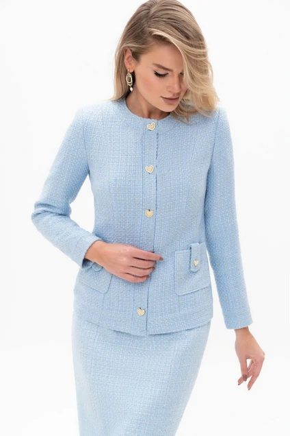 Стильный голубой твидовый жакет, станет идеальным дополнением к вашему гардеробу. Классический силуэт и мягкий материал подчеркнут ваш утонченный вкус, а изысканные детали в виде дизайнерских пуговиц мгновенно привнесут в образ нотку роскоши. Носите его с любимыми джинсами или сочетайте с платьем-футляр для создания неповторимого образа.