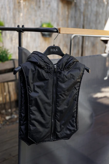 Капор выполнен из плащевой ткани с утеплителем Isosoft. Застежка на металлическую молнию. Низ переда и спинки фигурной формы. Спереди затягивается эластичной тесьмой с фиксаторами.