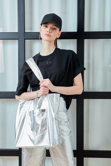 Современная мягкая сумка-шоппер, авторского кроя, из хлопковой ткани с напылением «металлик». Сумка имеет прямоугольную форму. Передняя стенка с настрочным фигурным карманом. Сумка на подкладке. Ручки широкие, возможно ношение через плечо.