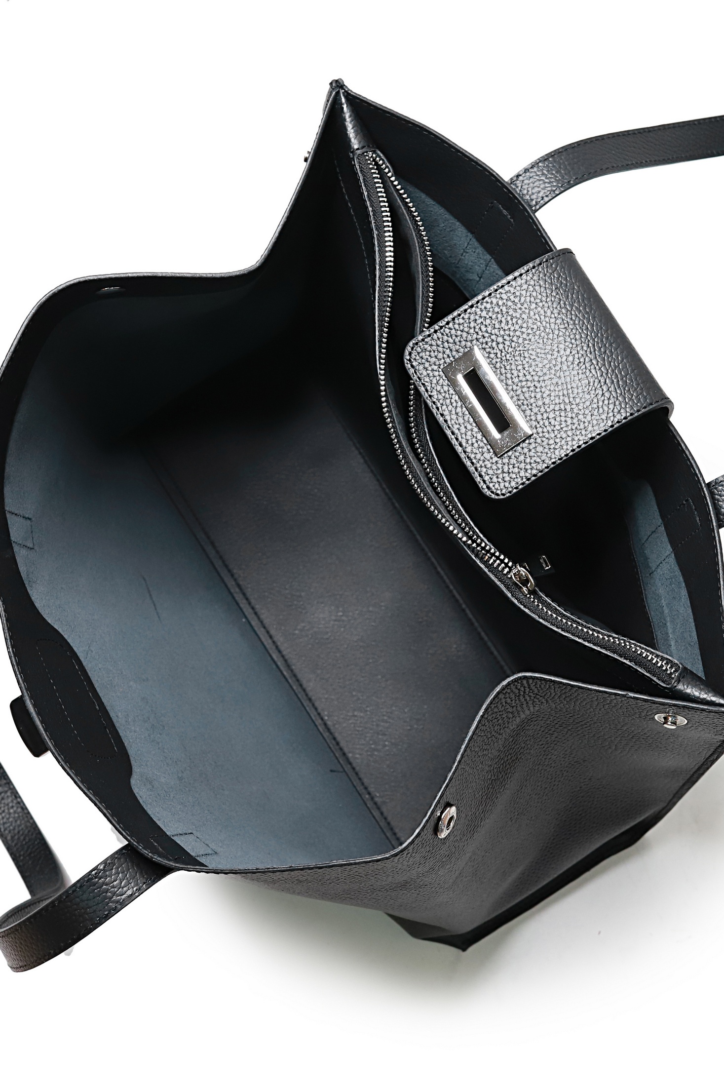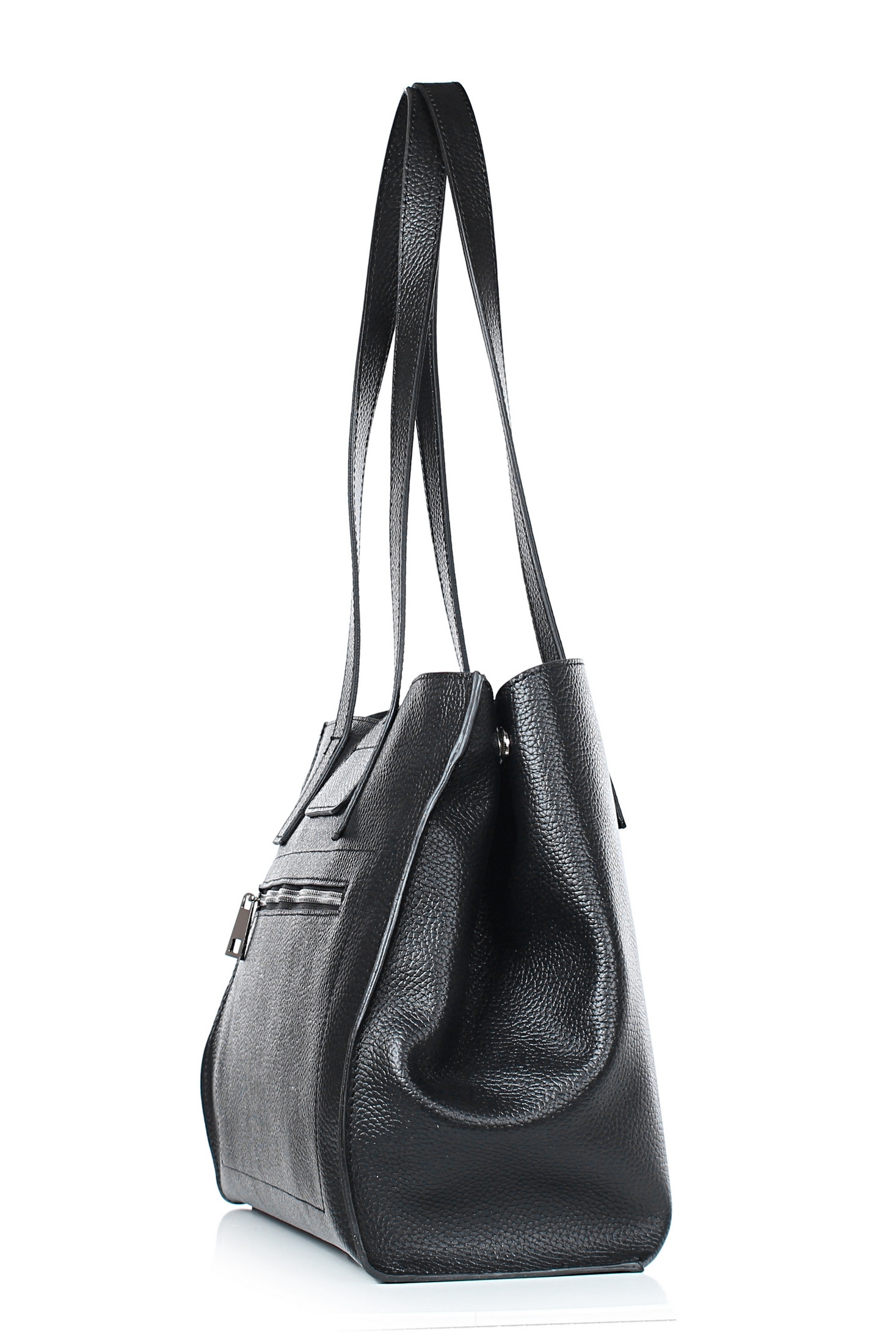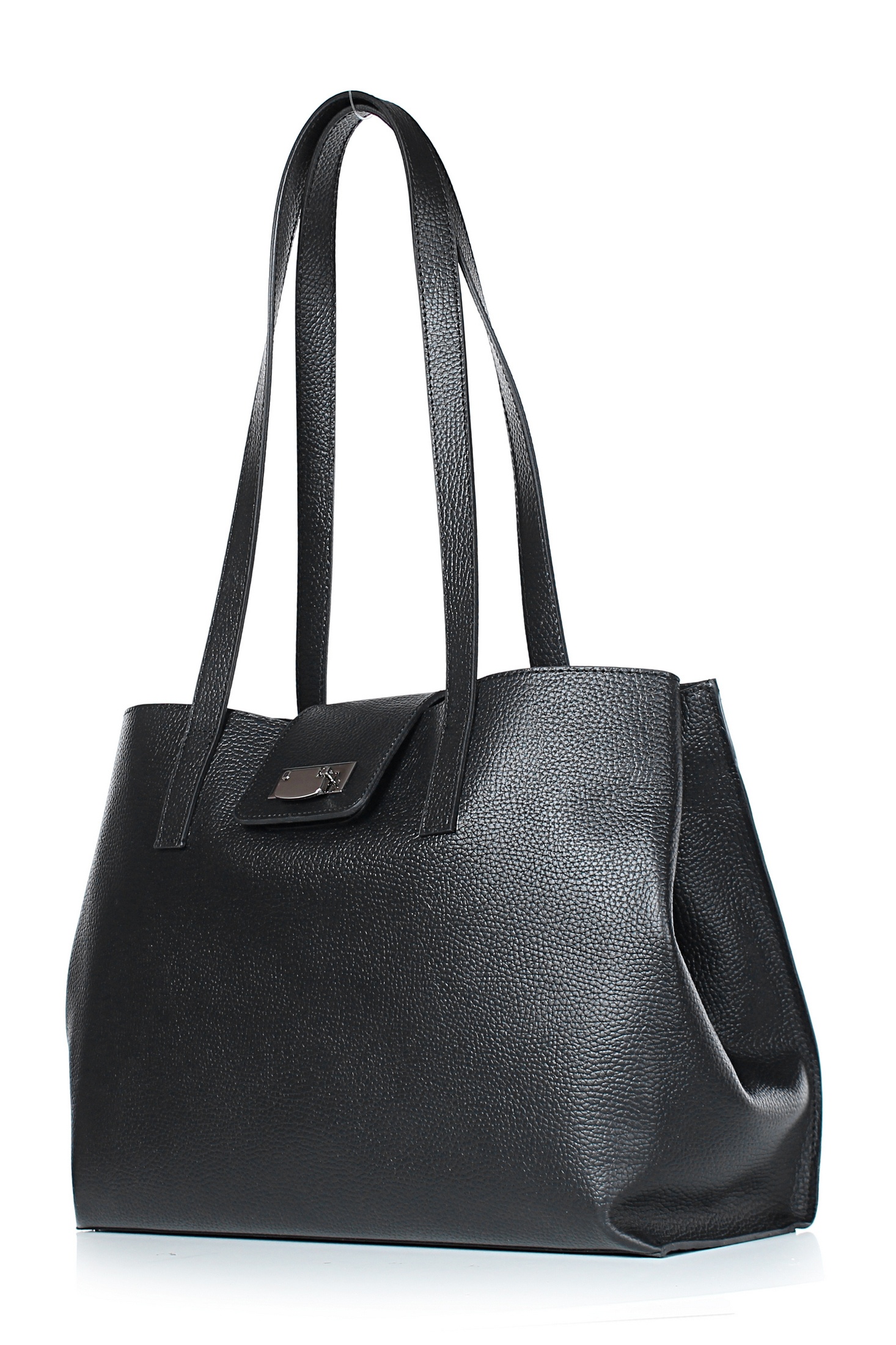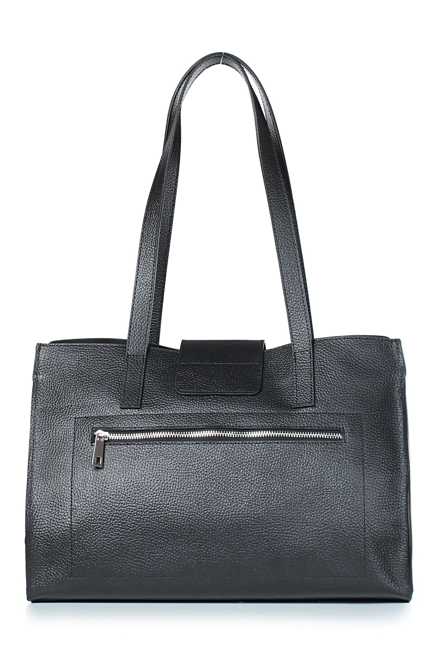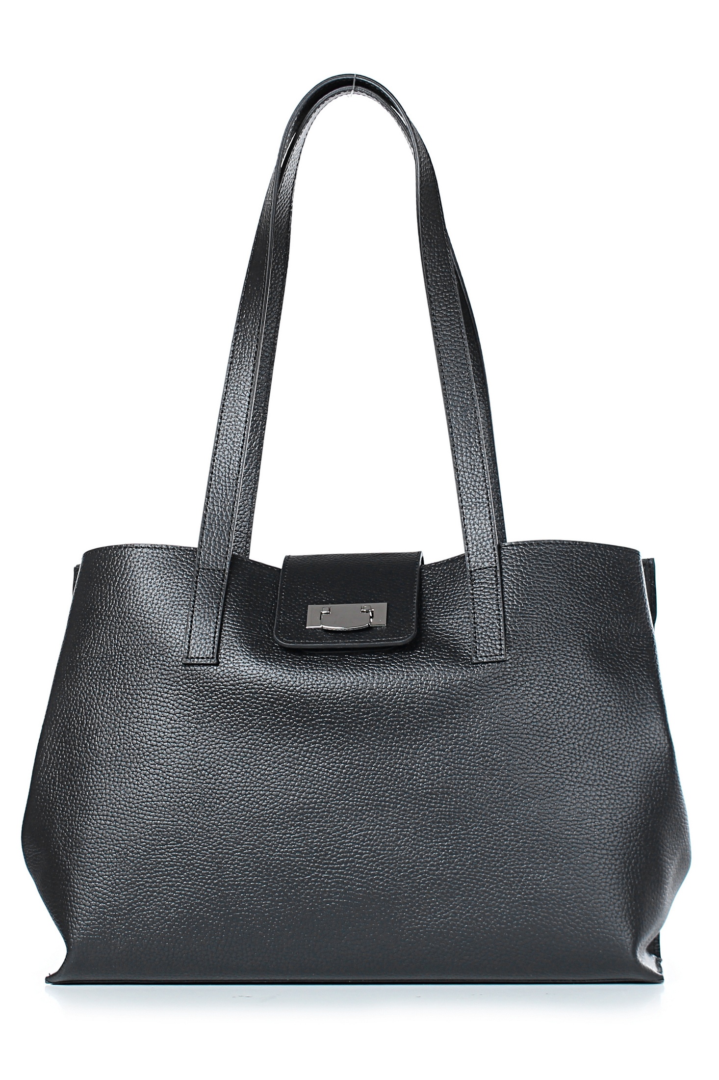 Сумка на одно отделение, закрывающееся клапаном на замок-клипсу, с двумя ручками длиной 670+-10 мм, с карманом на задней стенке, закрывающимся на застёжку-молнию, с кнопками на боковых верхних частях стенок. Цвет фурнитуры - никель. Сумка частично на подкладке, с подкладкой дна, с карманом-перегородкой, закрывающимся на застежку-молнию, с футляром для пластиковых карт.