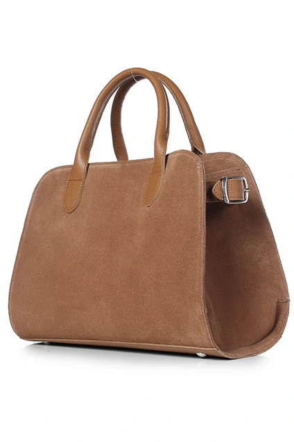 Сумка на одно отделение, закрывающееся на карабин, с двумя короткими ручками длиной 380+-10мм, с двумя боковыми стяжными ремнями, с пуклями на дне. Цвет фурнитуры - никель. Сумка на подкладке, с открытым карманом с украшением, с карманом-перегородка, закрывающимся на застежку-молнию и соединенным с задней стенкой замком-магниткой.