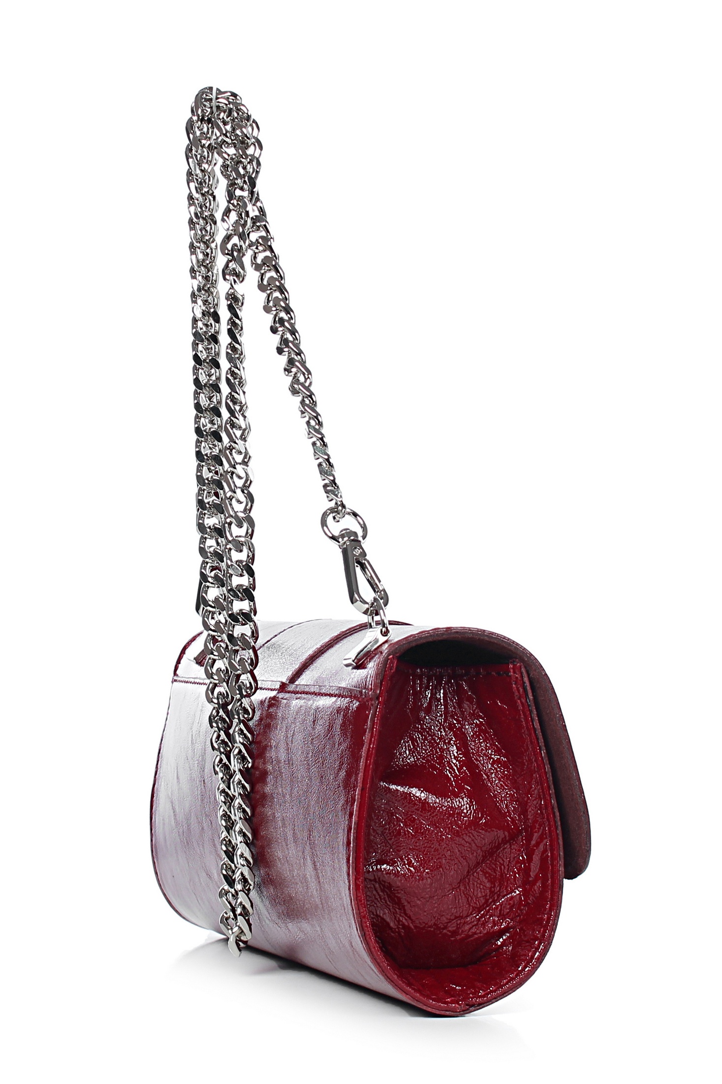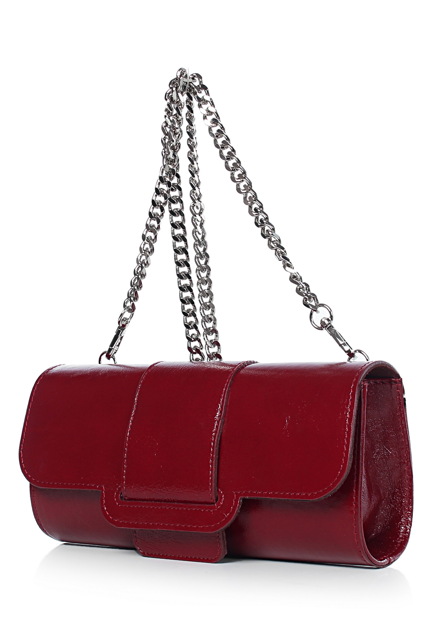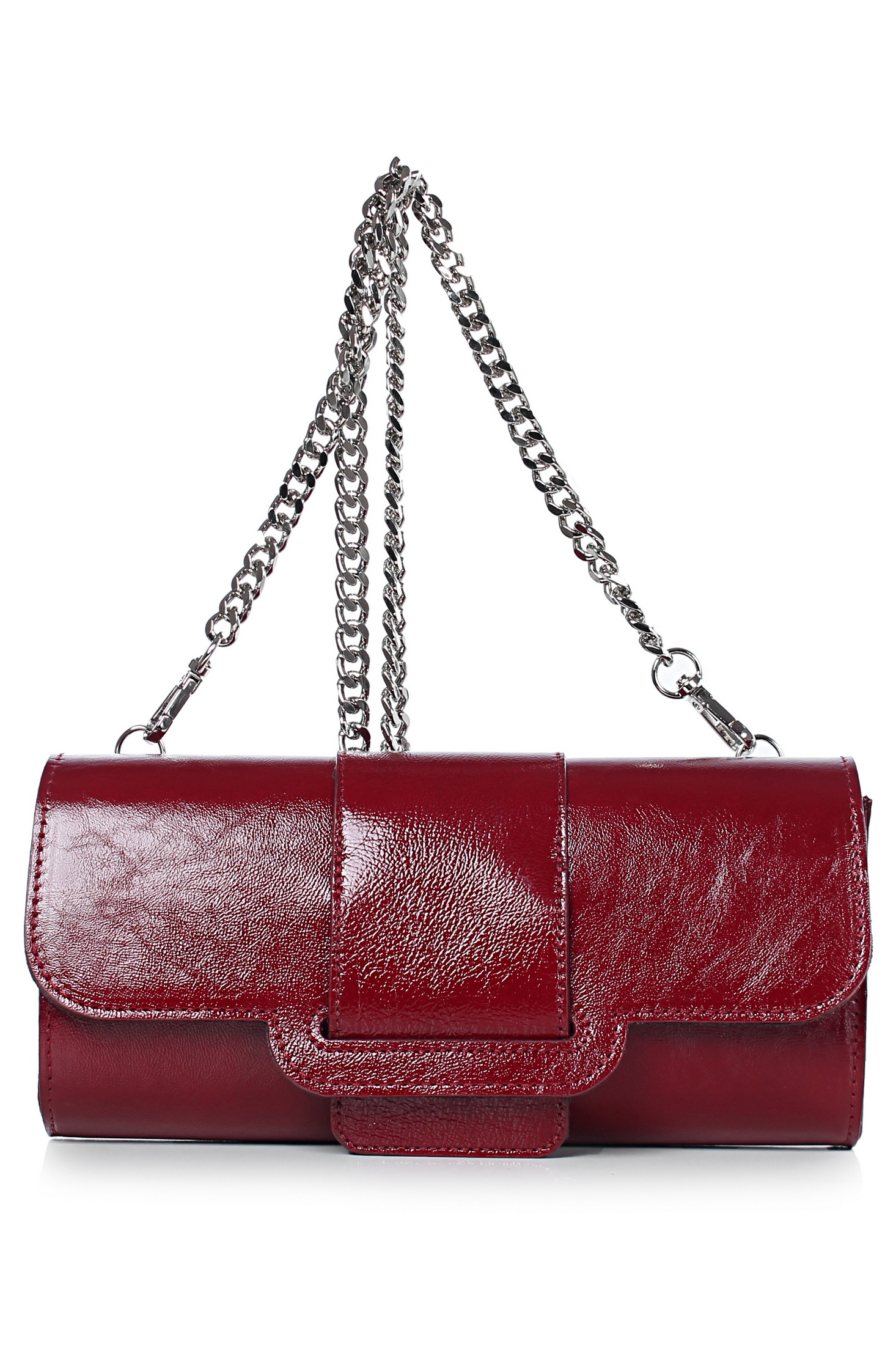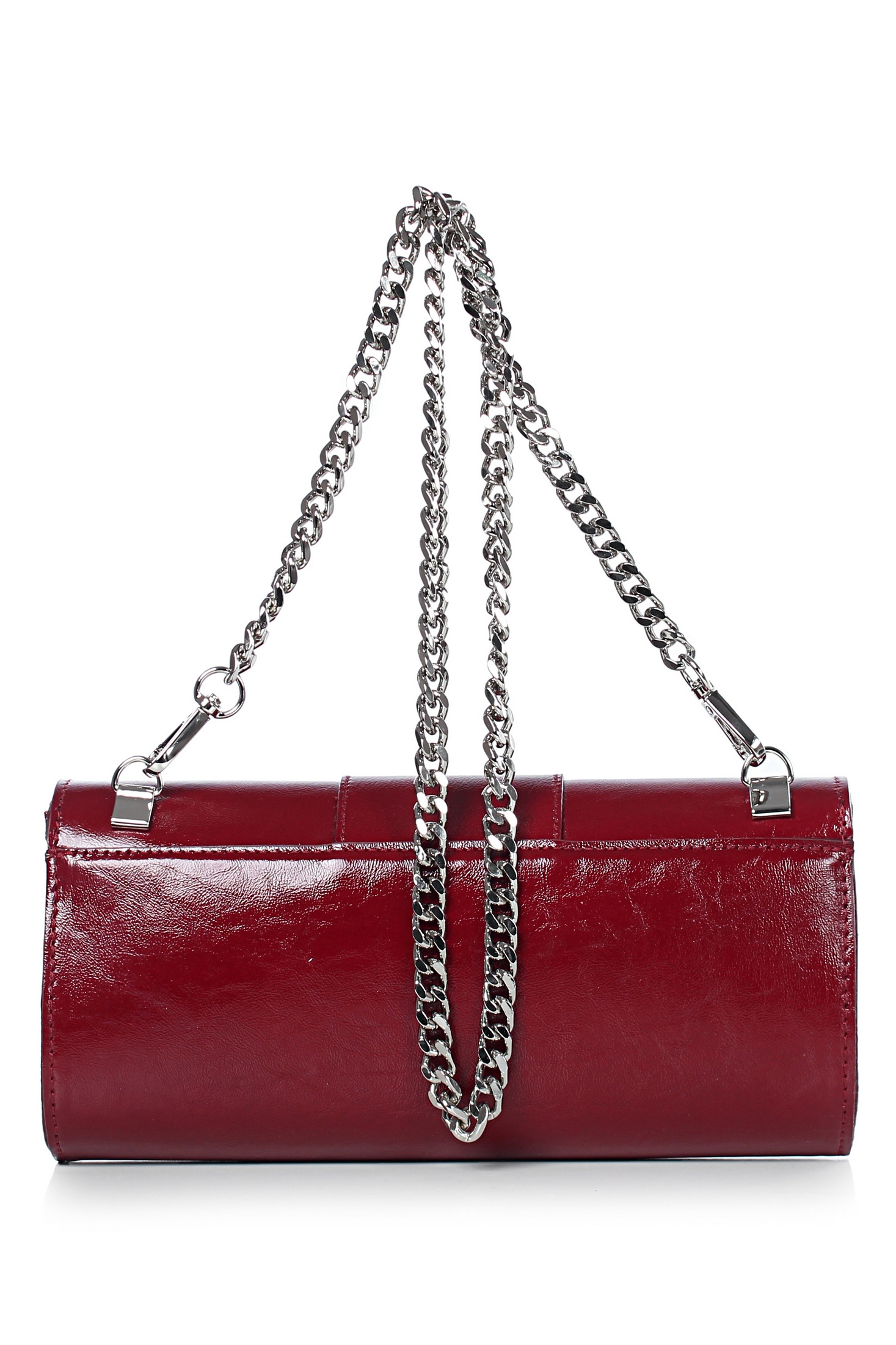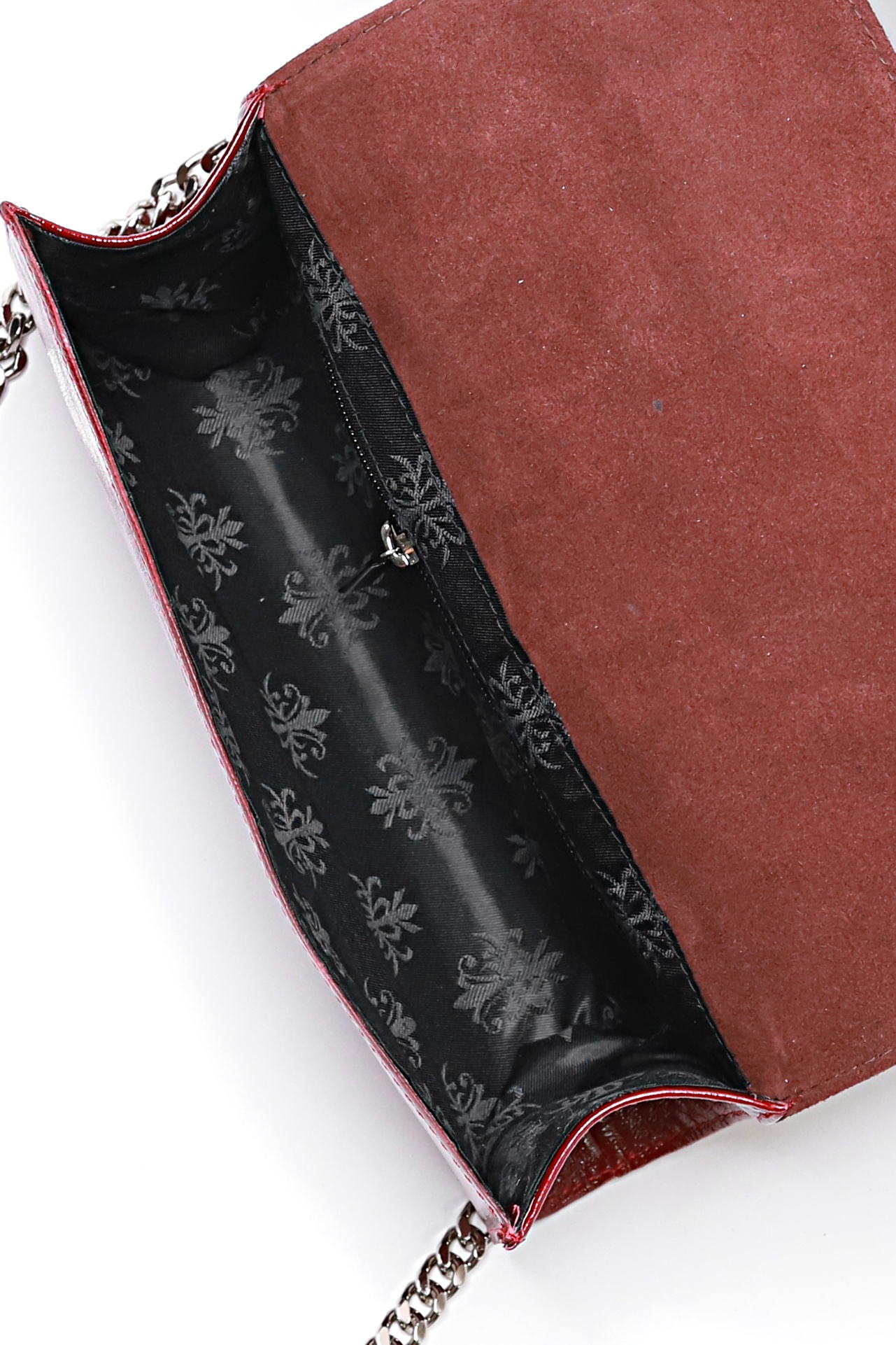 Клатч на одно отделение, закрывающееся клапаном на замок-магнитку, со съемной ручкой из цепи длиной 930+-10мм. Цвет фурнитуры - никель. Клатч на подкладке, с подвесным карманом, закрывающимся на застежку-молнию, с футляром для пластиковых карт.