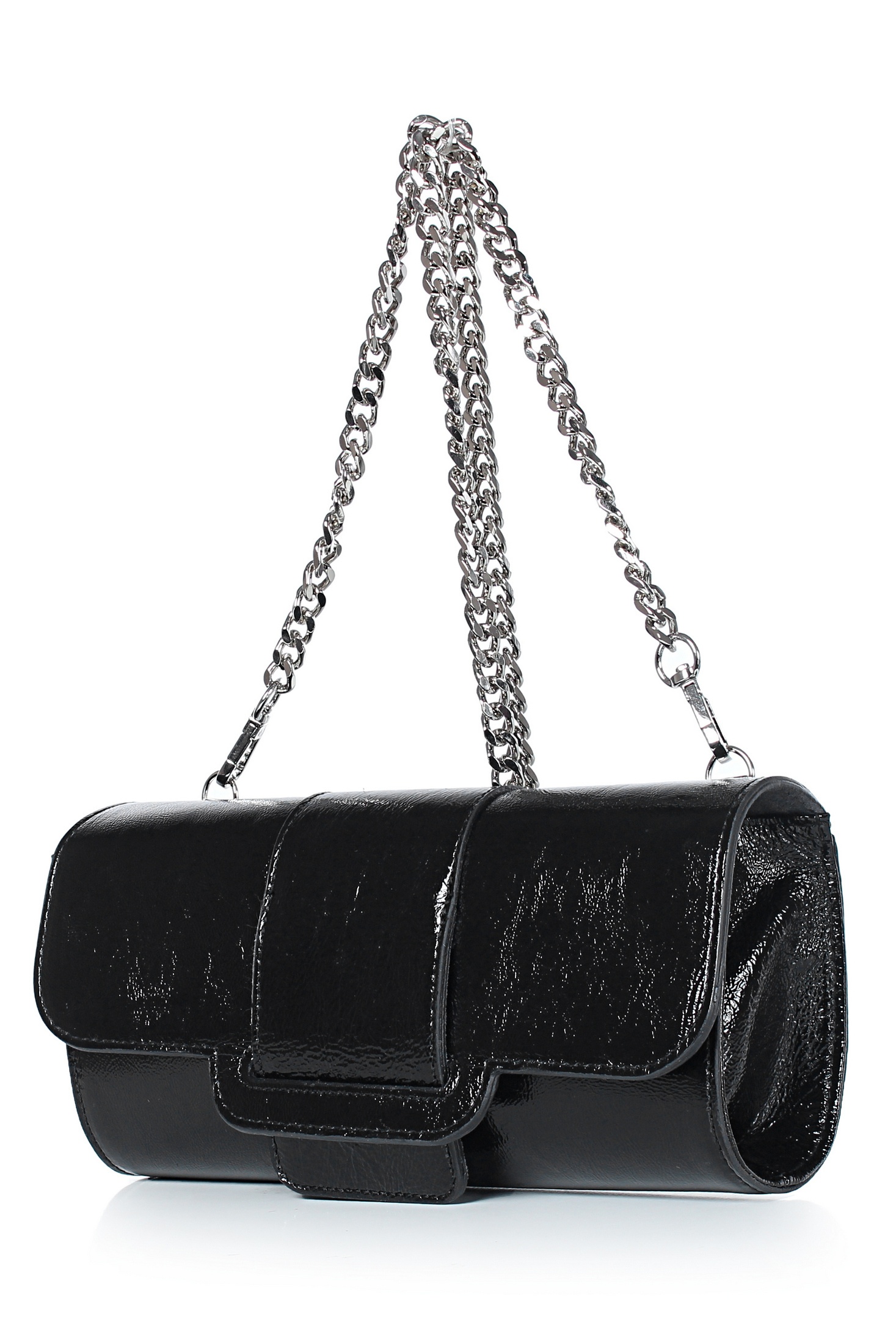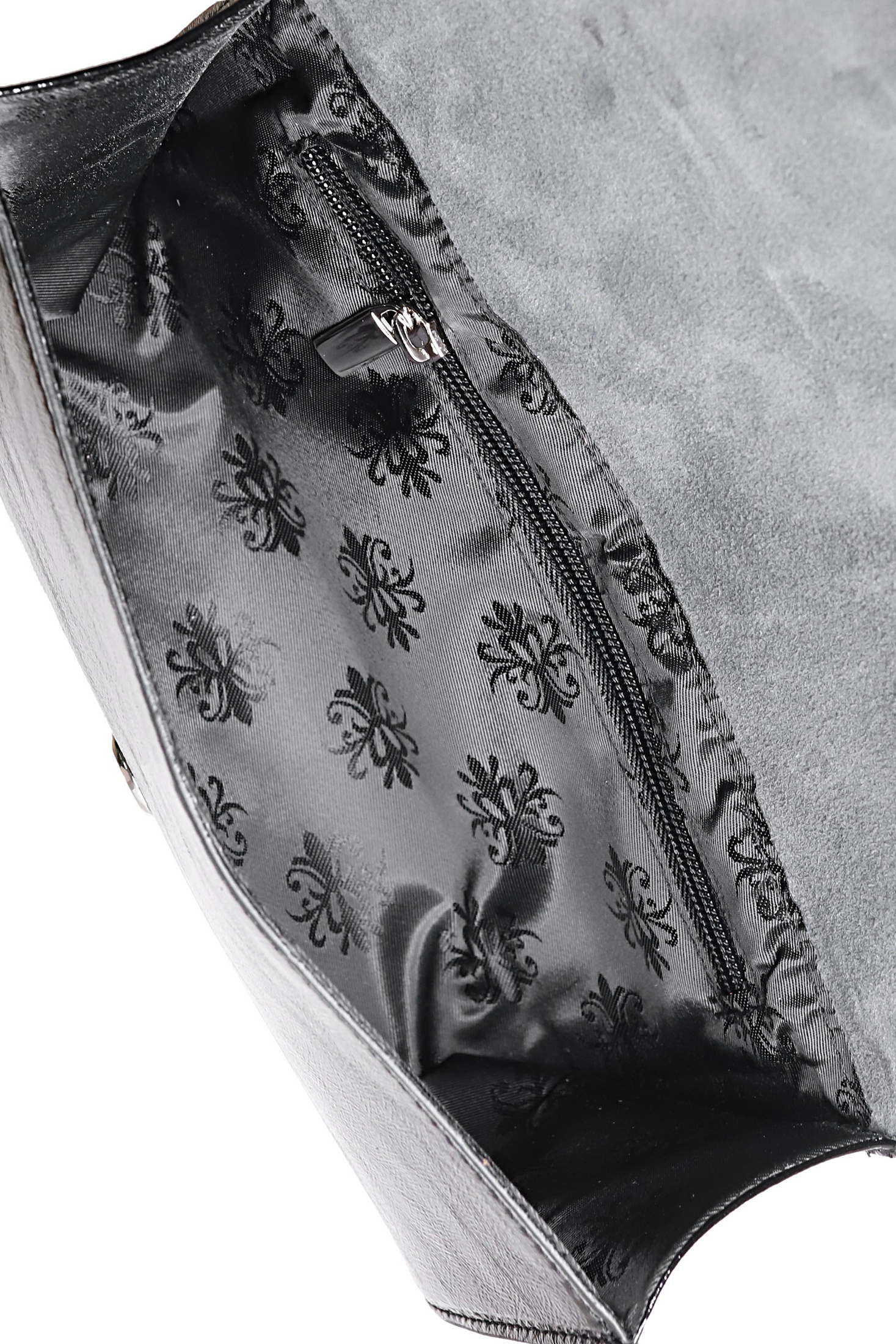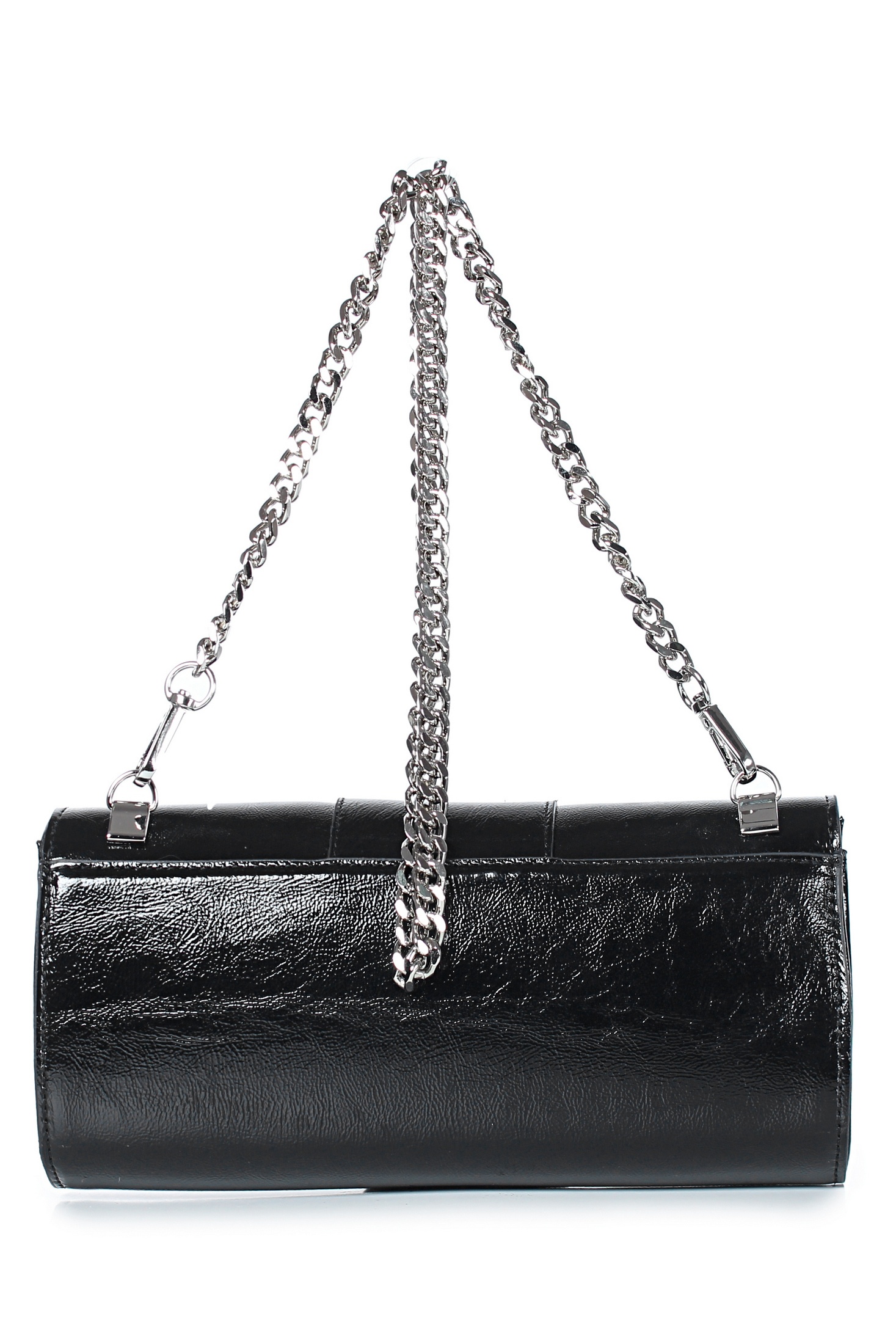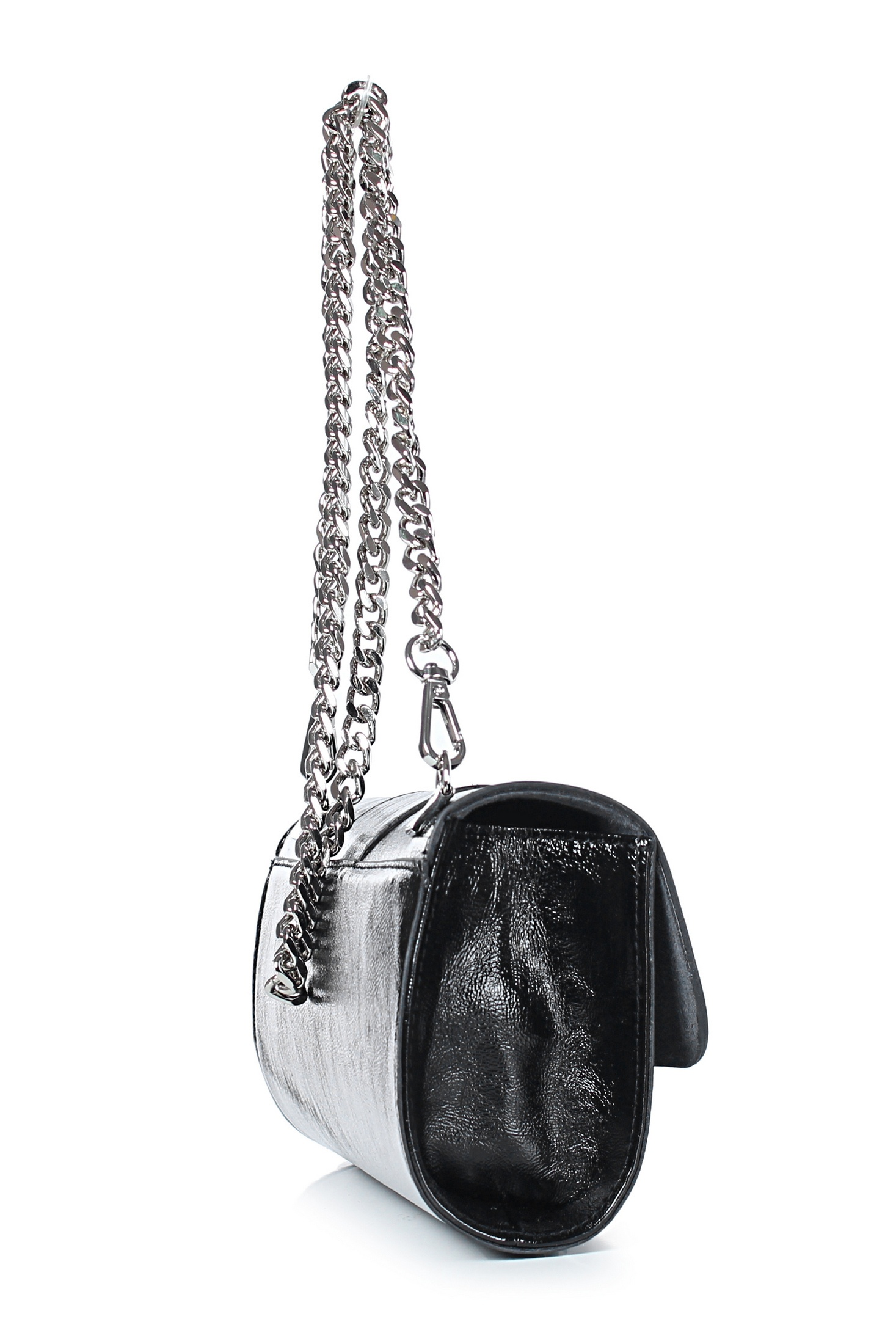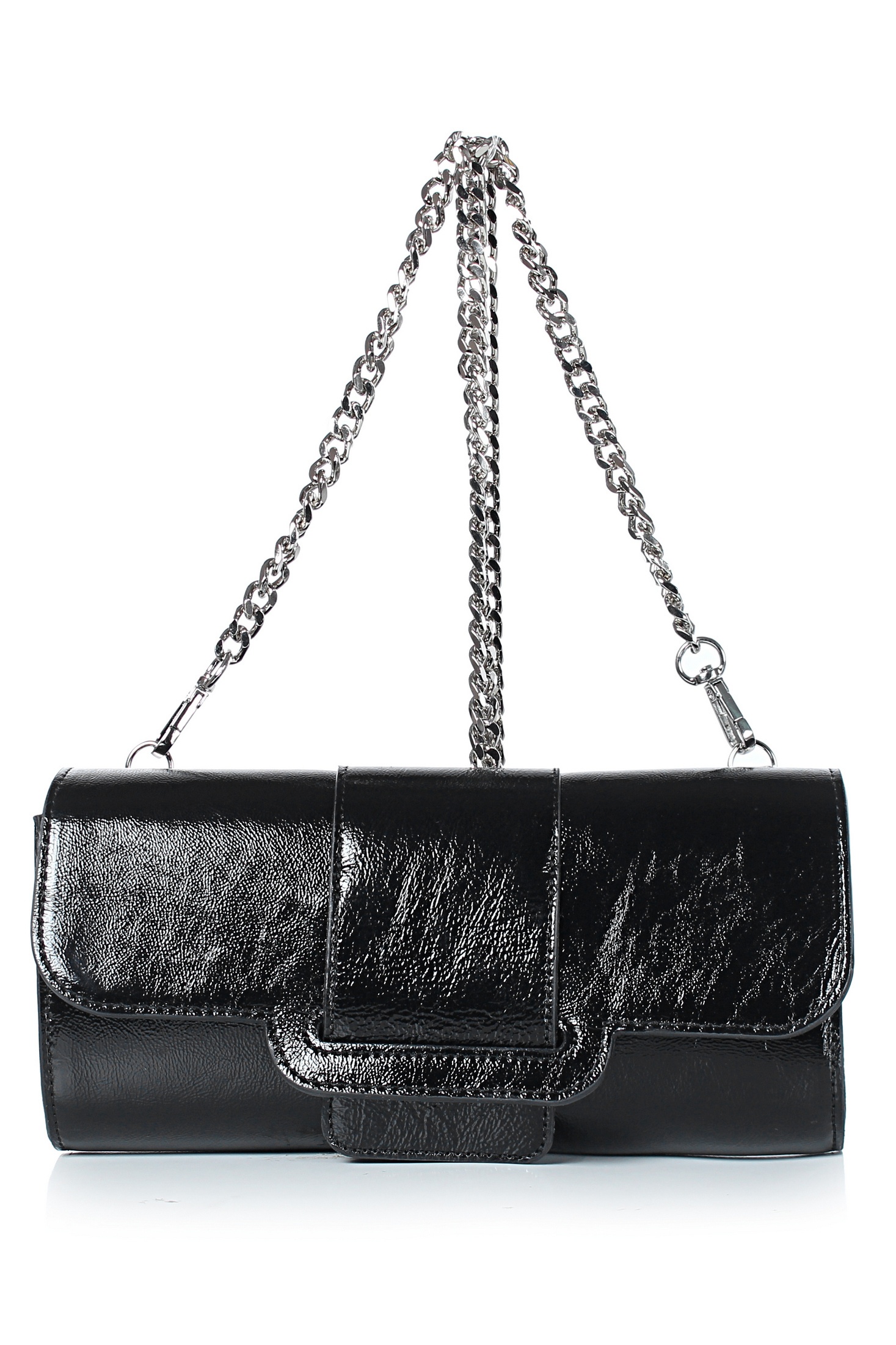 Клатч на одно отделение, закрывающееся клапаном на замок-магнитку, со съемной ручкой из цепи длиной 930+-10мм. Цвет фурнитуры - никель. Клатч на подкладке, с подвесным карманом, закрывающимся на застежку-молнию, с футляром для пластиковых карт.