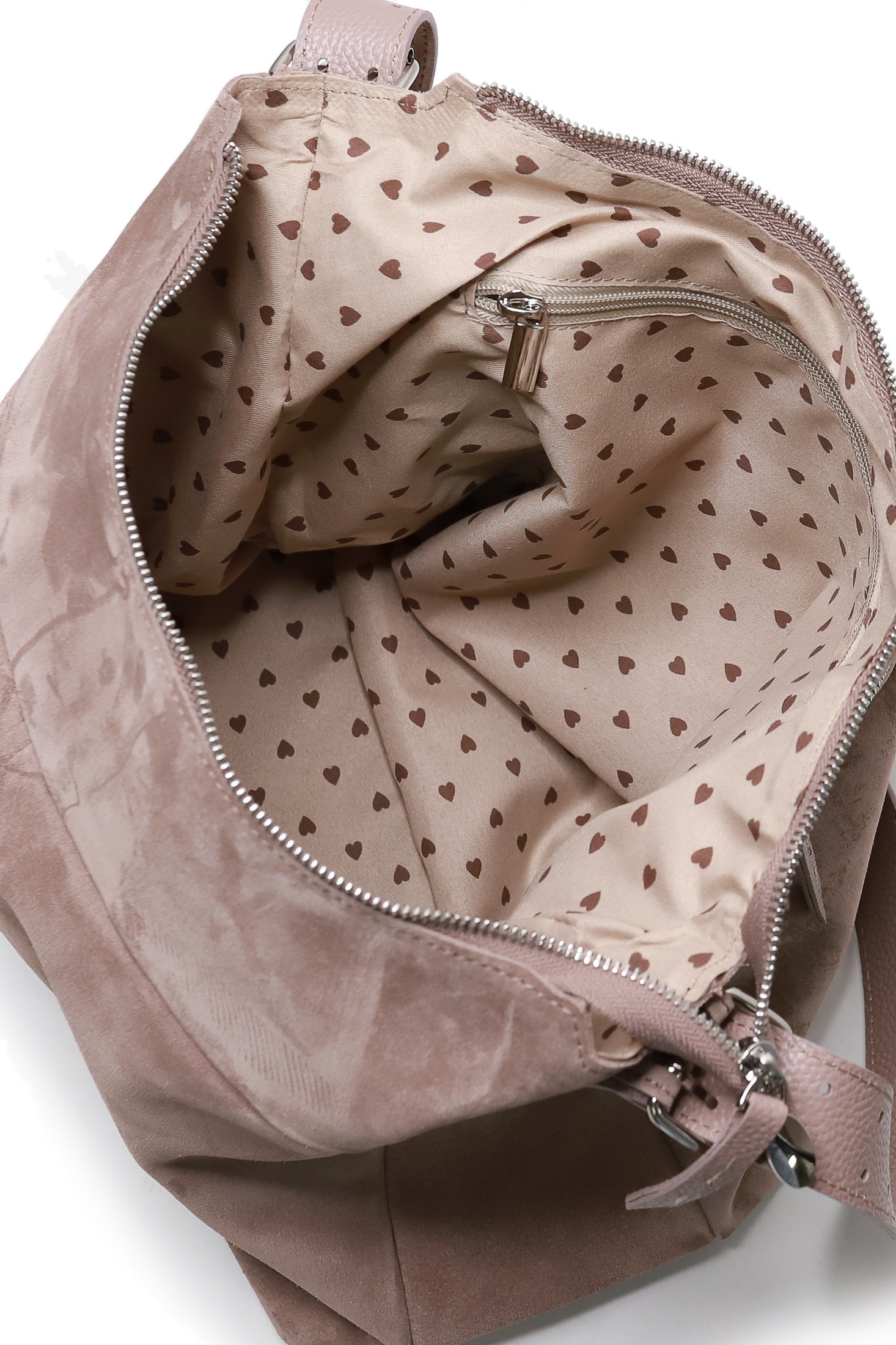 Сумка на подкладке, с открытым карманом с украшением, с карманом, закрывающимся на застежку-молнию.