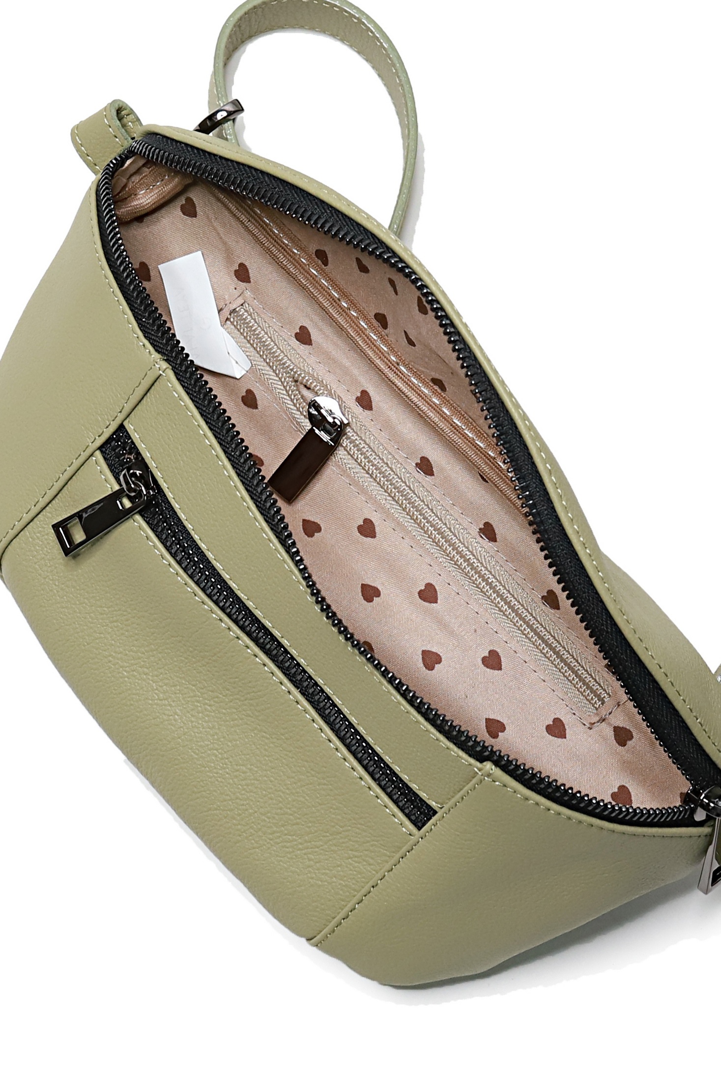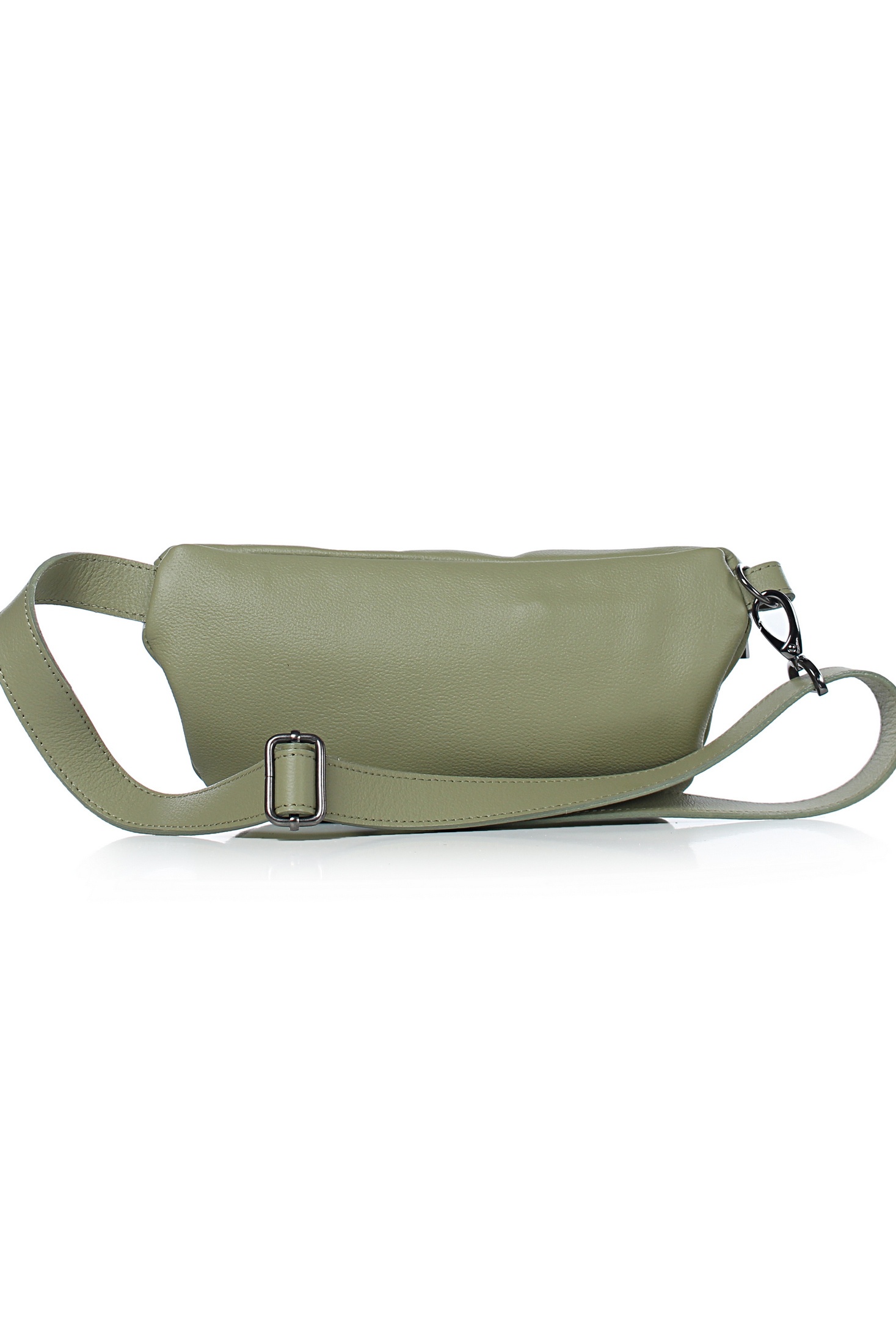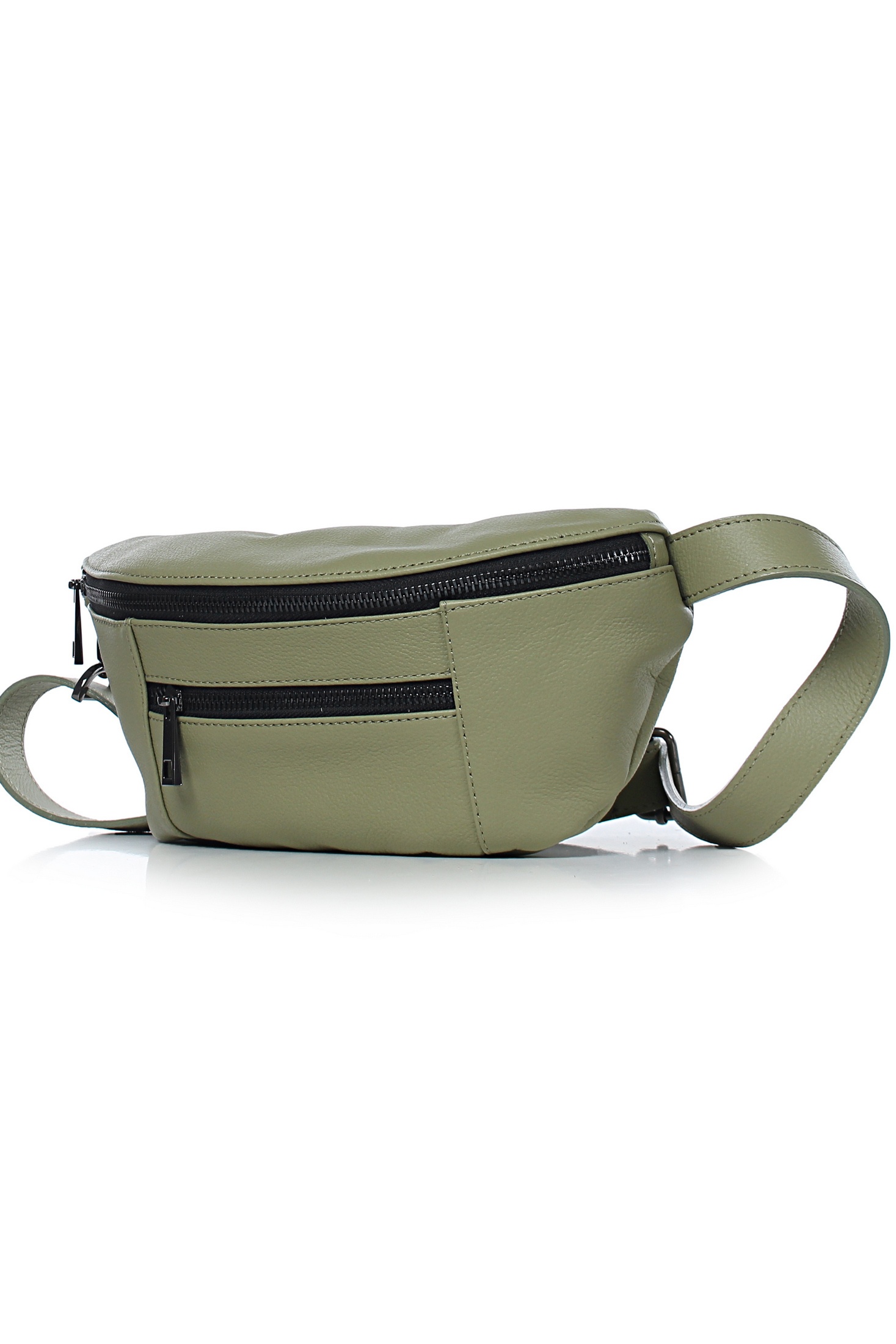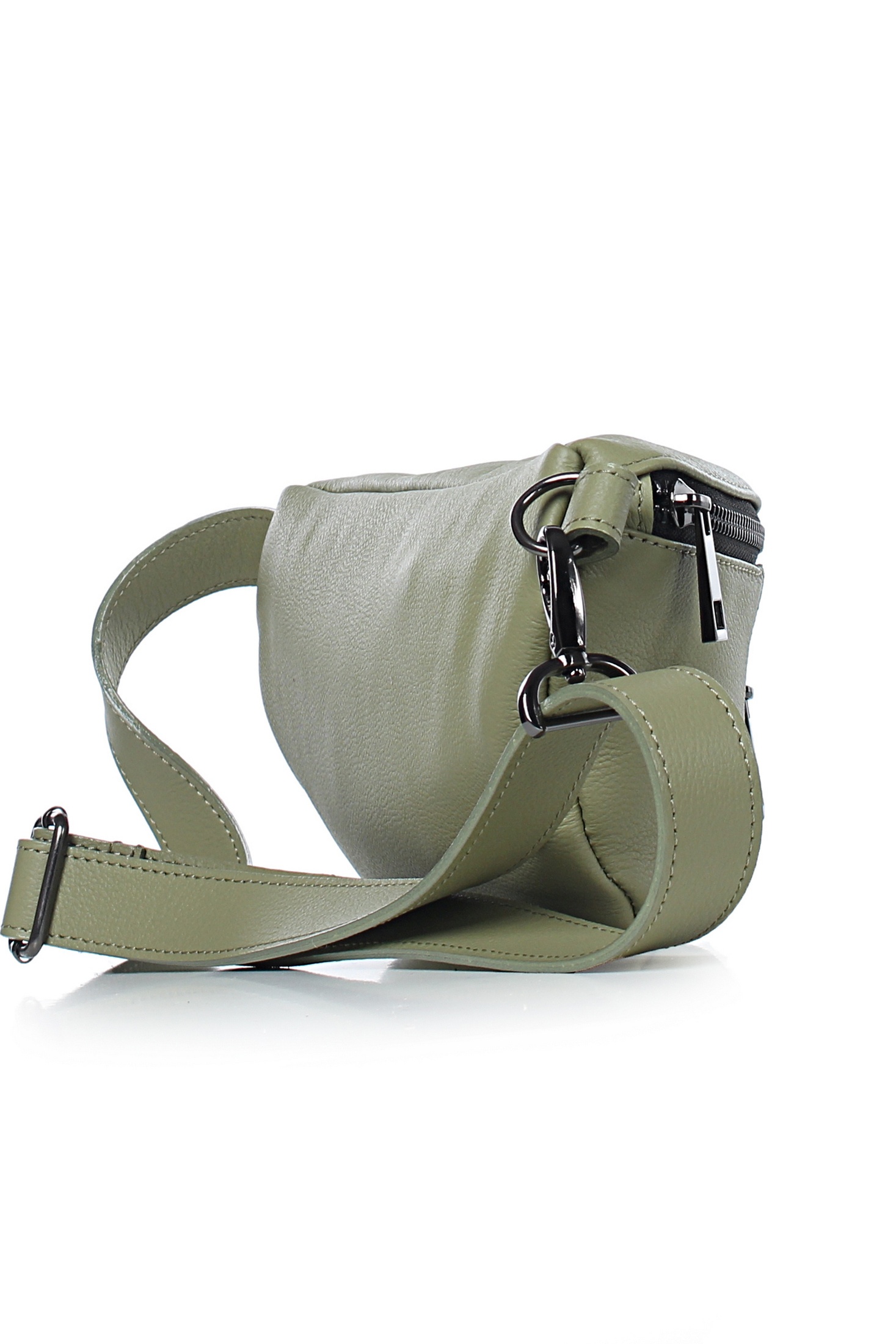 Сумка закрывается клапаном на застёжку-молнию, с регулирующимся ремнём, с боковым держателем с полукольцом, с карманом на передней стенке, закрывающимся на застежку-молнию. Фурнитура - чернёный никель. Длина ремня - 850 мм.