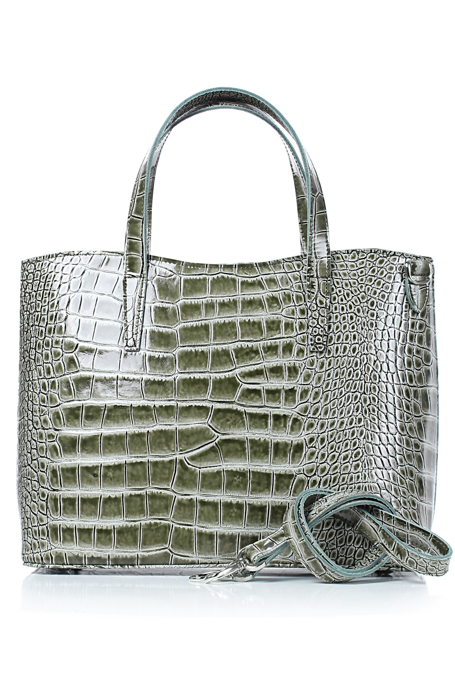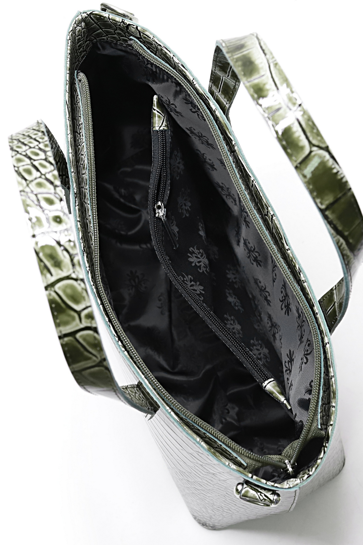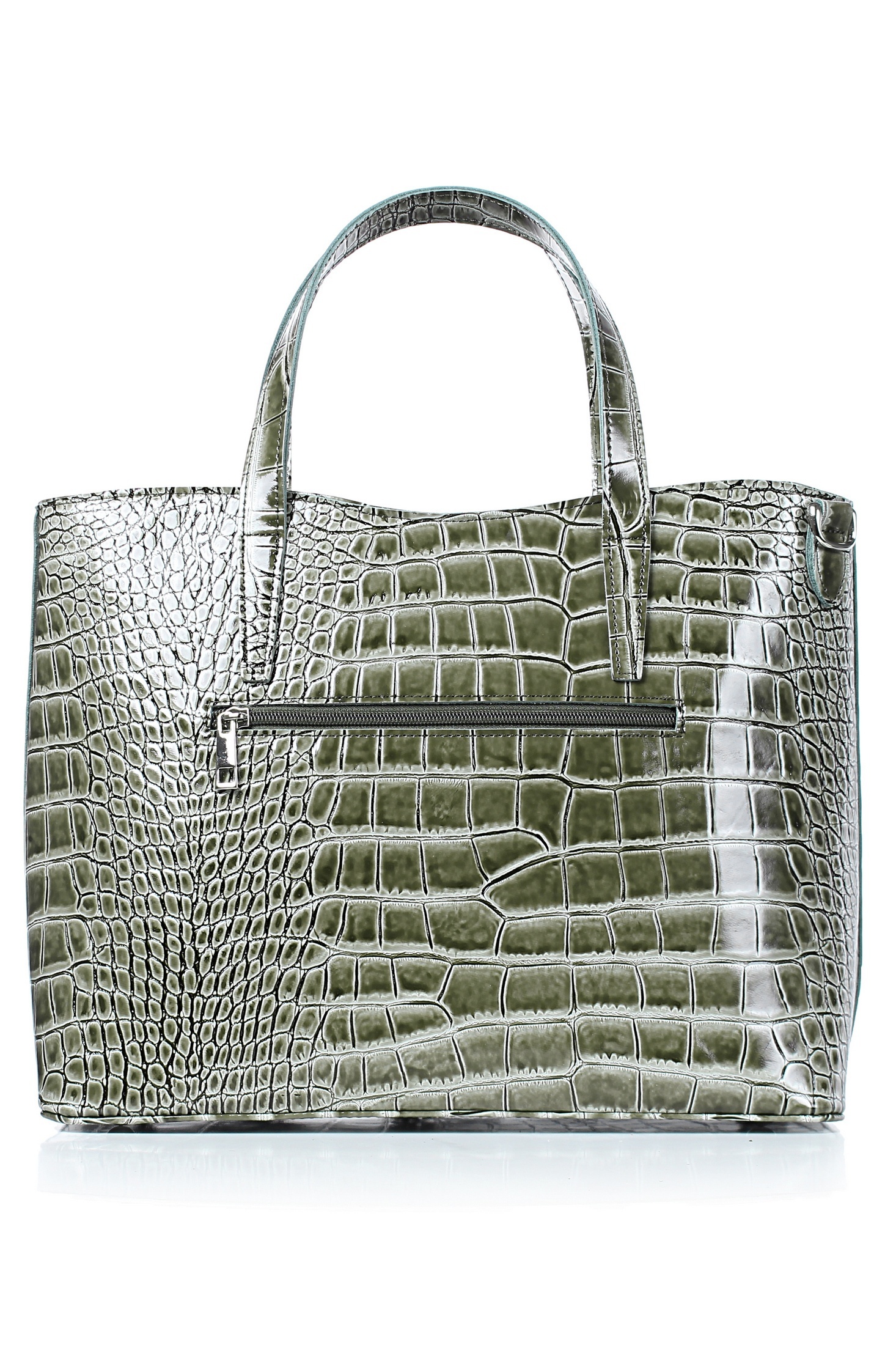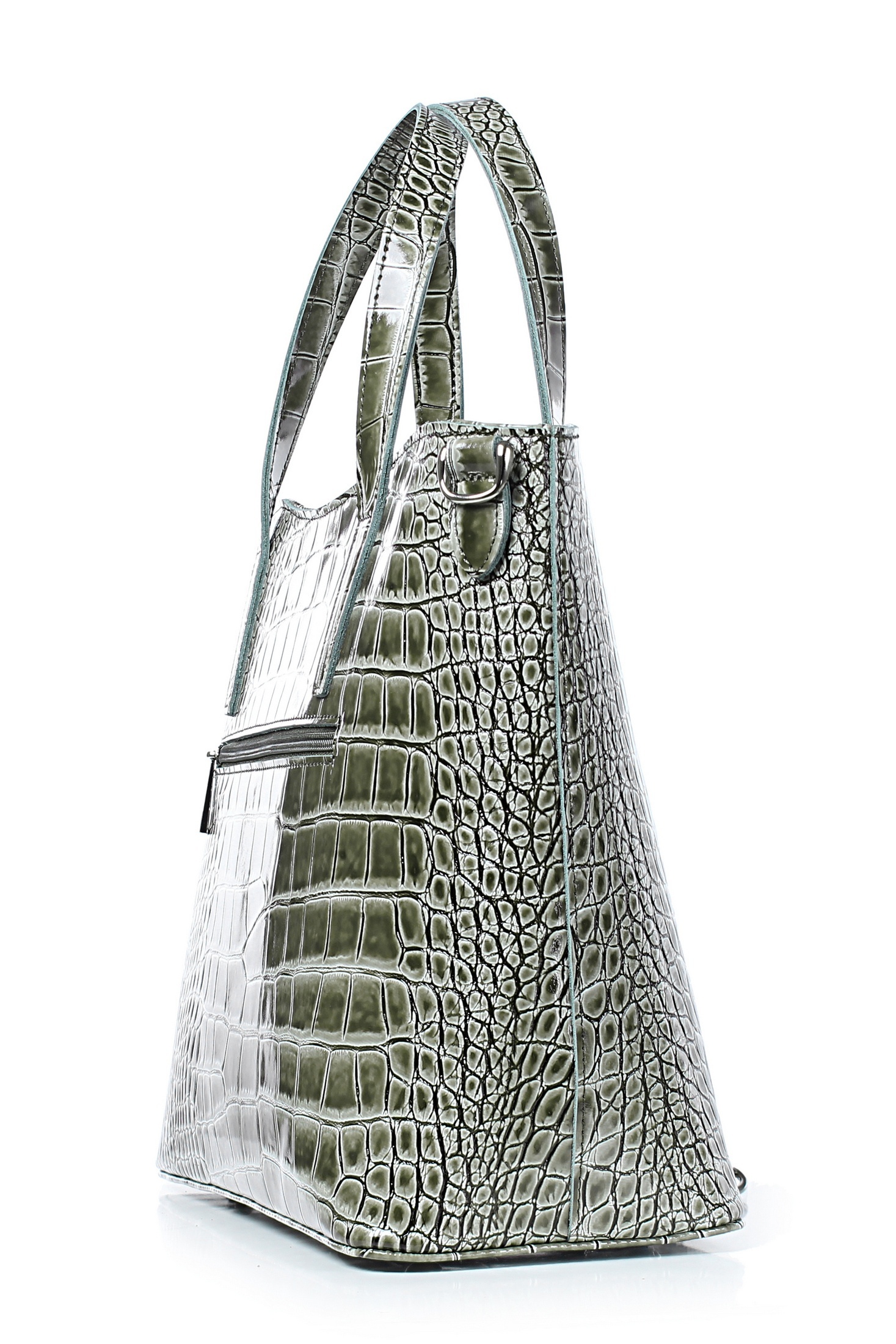 Сумка на одно отделение, закрывающееся на застежку-молнию, с двумя ручками длиной 410+-10 мм, со съемной нерегулирующейся ручкой-ремнем длиной 930+-10 мм, с карманом на задней стенке, закрывающимся на застежку-молнию, с боковыми держателями, с пуклями на дне. Цвет фурнитуры - никель. Сумка на подкладке, с карманом-перегородкой, закрывающимся на застежку-молнию, с открытым карманом с украшением, с футляром для пластиковых карт.