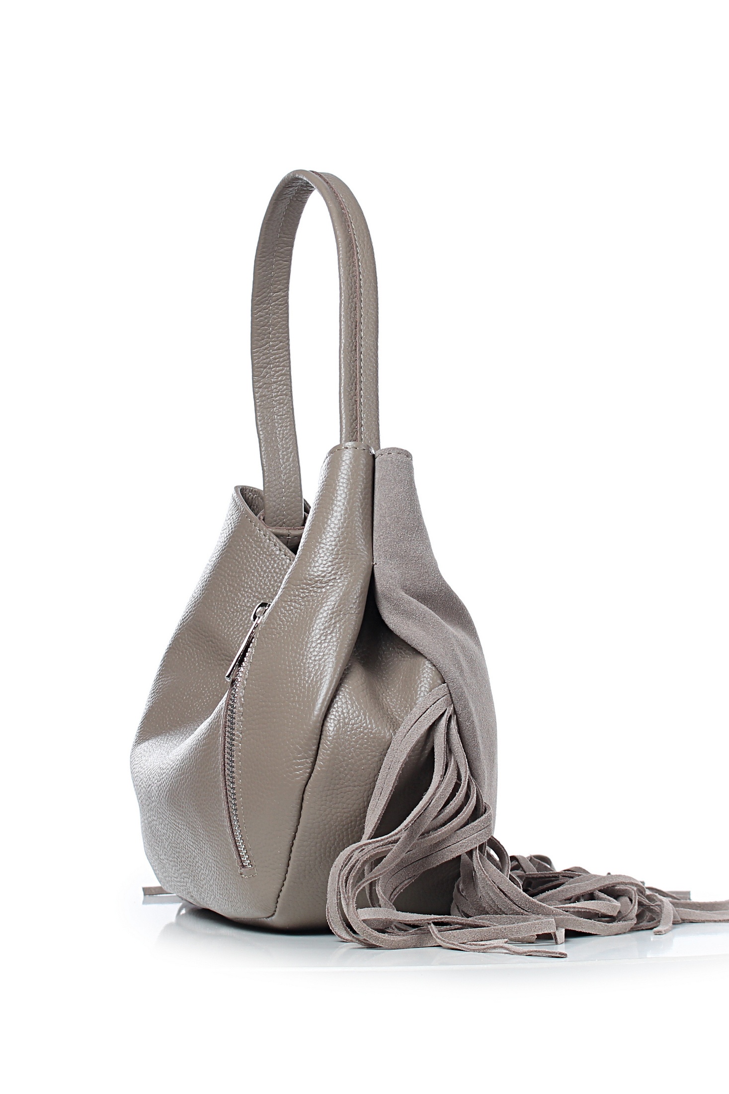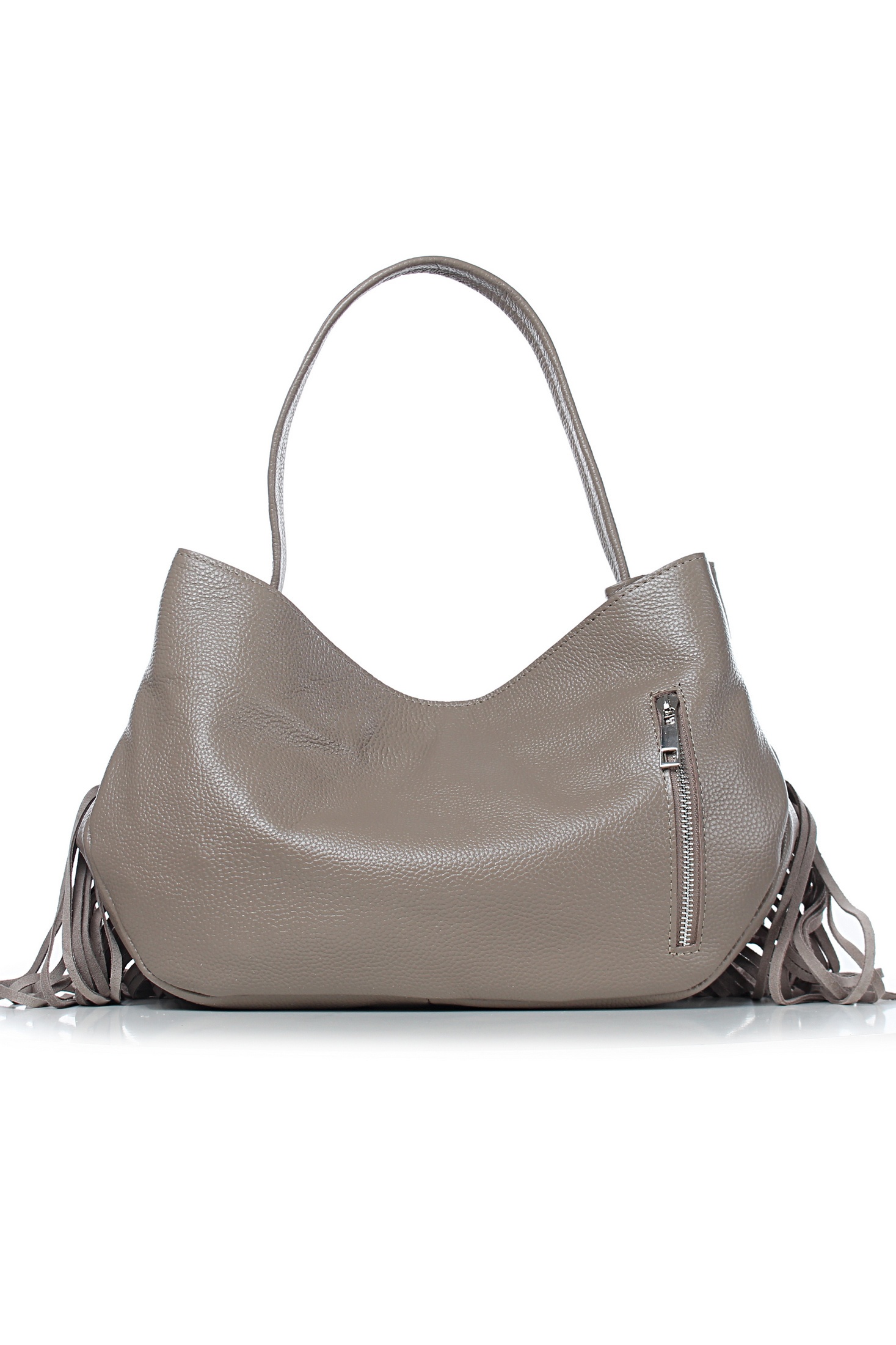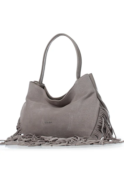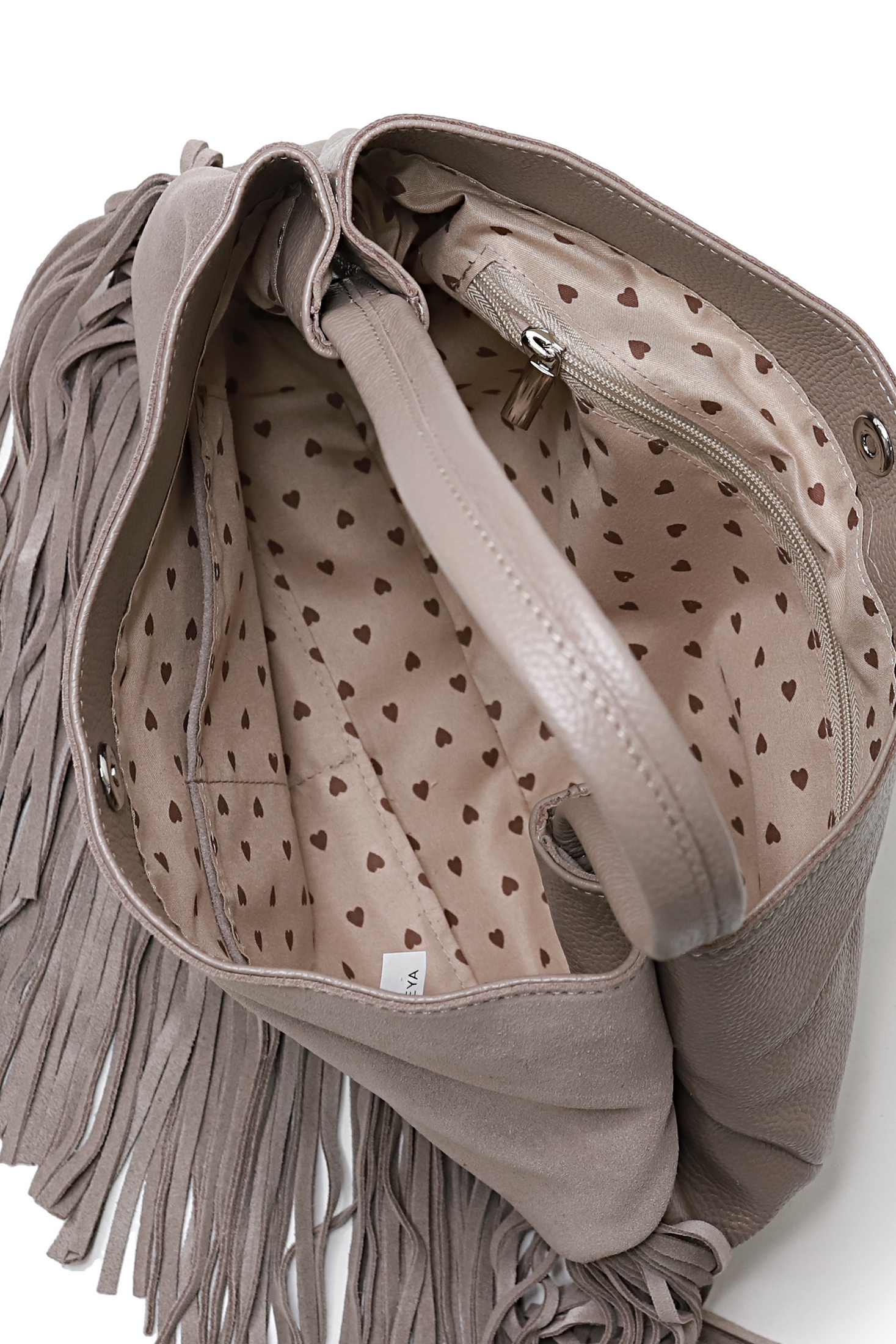Сумка на одно отделение, закрывающееся на замок-магнитку, с одной ручкой длиной 430+-10 мм,с карманом на задней стенке, закрывающийся на застежку-молнию, с украшением-лейбл на передней стенке и украшением (бахрома) в нижней части передней стенки. Цвет фурнитуры - никель. Сумка на подкладке, с открытым карманом с украшением, с подвесным карманом, закрывающимся на застежку-молнию, с футляром для пластиковых карт.