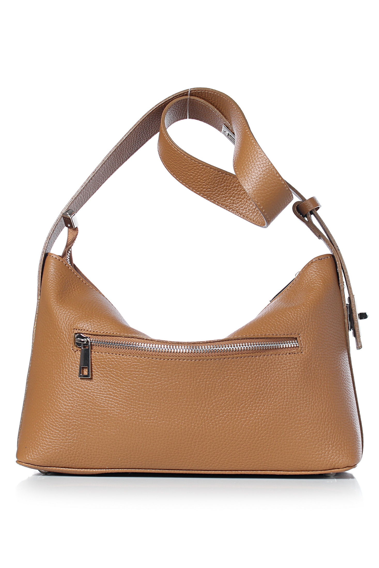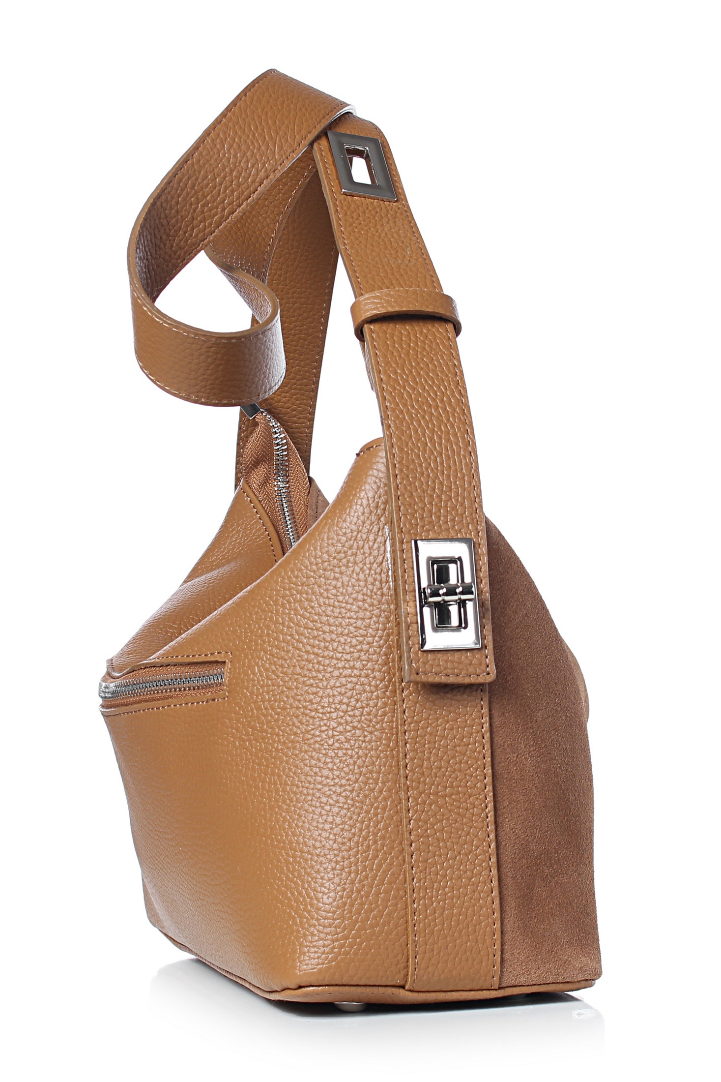 Сумка на одно отделение, закрывающееся клапаном на замок-вертушку, с одной короткой ручкой длиной 330+-10 мм, с обтяжкой на ручке, со съемной регулирующейся ручкой-ремнем максимальной длины 1285+-10 мм, с пуклями на дне. Цвет фурнитуры - никель. Сумка на подкладке, с открытым карманом с украшением, с карманом-перегородкой, закрывающимся на застежку-молнию и соединенным с задней стенкой замком-магнитокой, с футляром для пластиковых карт.