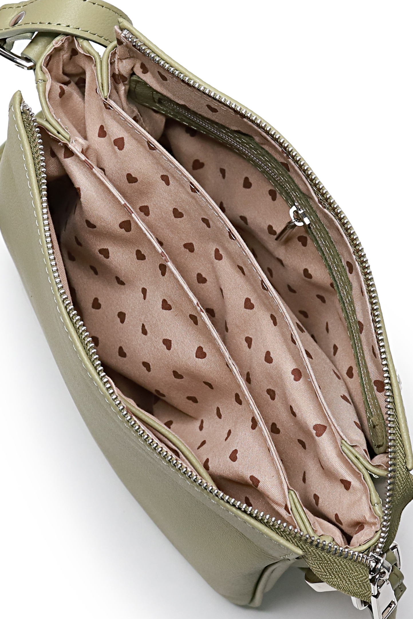 Сумка на три отделения, закрывающиеся на застежку-молнию, с регулирующейся ручкой-ремнем длиной 1120+-10 мм, с боковыми держателями, с прокладкой кедера. Цвет фурнитуры - никель. Сумка на подкладке,с открытым карманом с украшением, с подвесным карманом, закрывающимся на застежку-молнию, с декоративной накладкой на кармане.