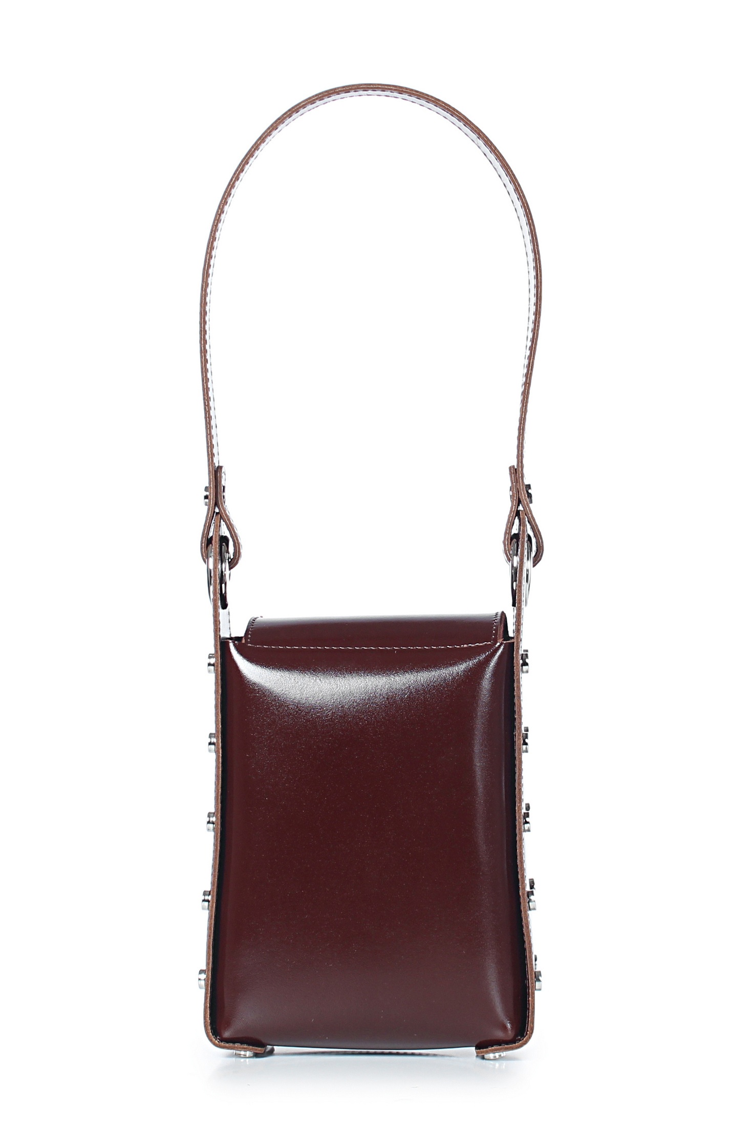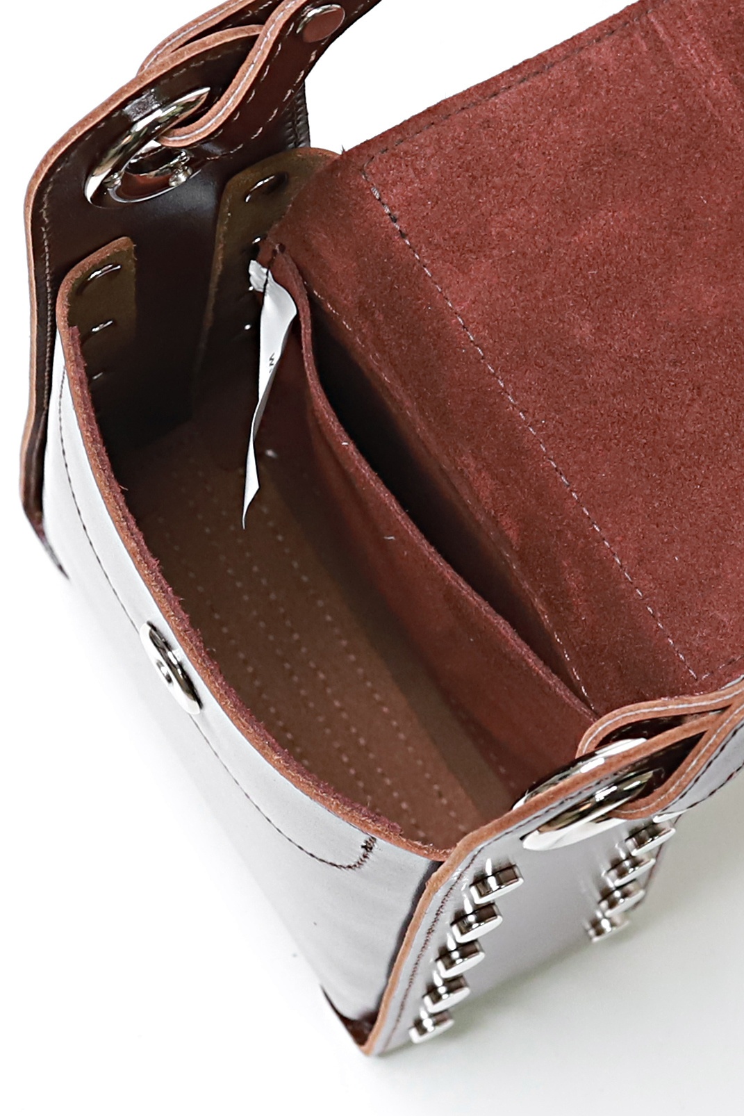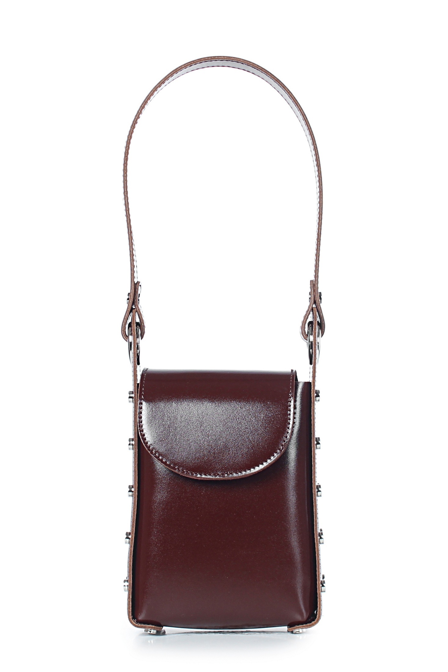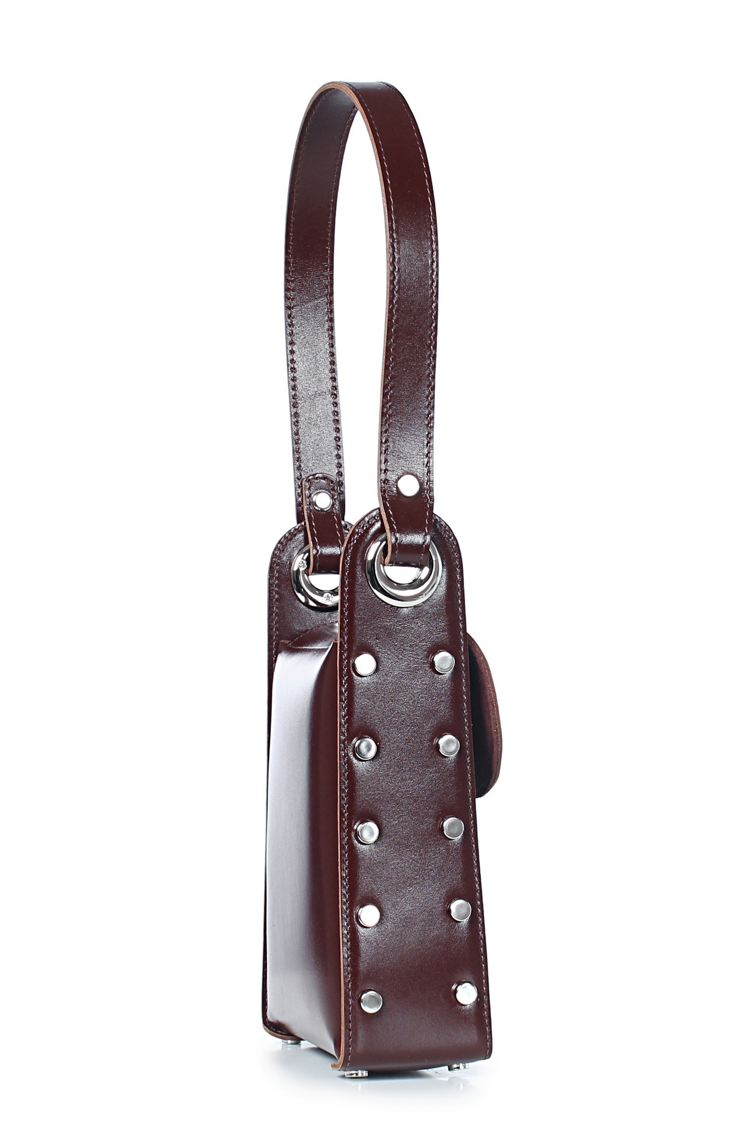 Сумка на одно отделение, закрывающееся клапаном на замок-магнитку, с одной короткой ручкой длиной 510+-10 мм, с декоративными заклепками на клинчиках. Цвет фурнитуры - никель. Сумка частично на подкладке, с открытым карманом.