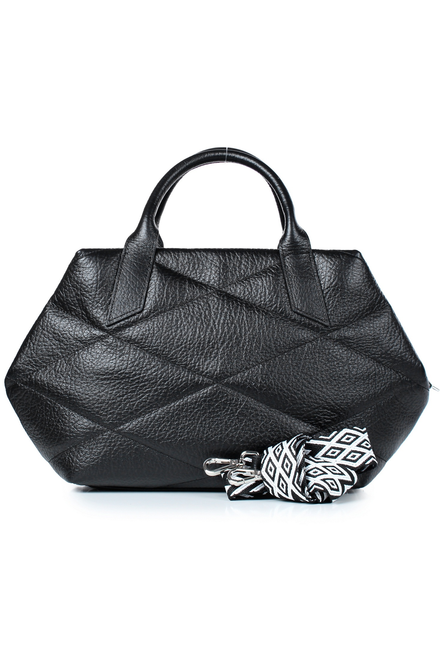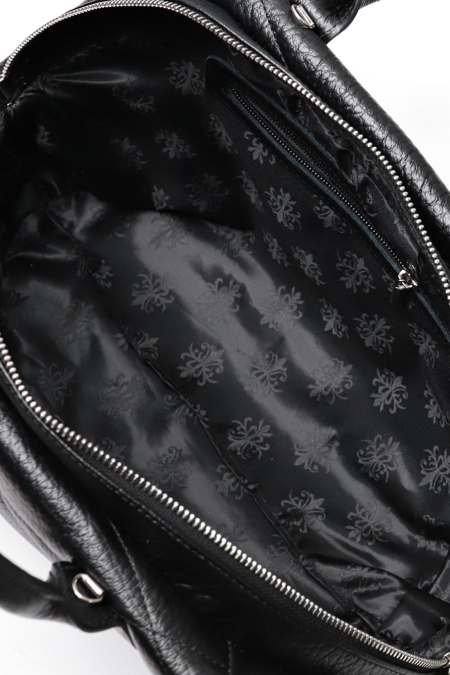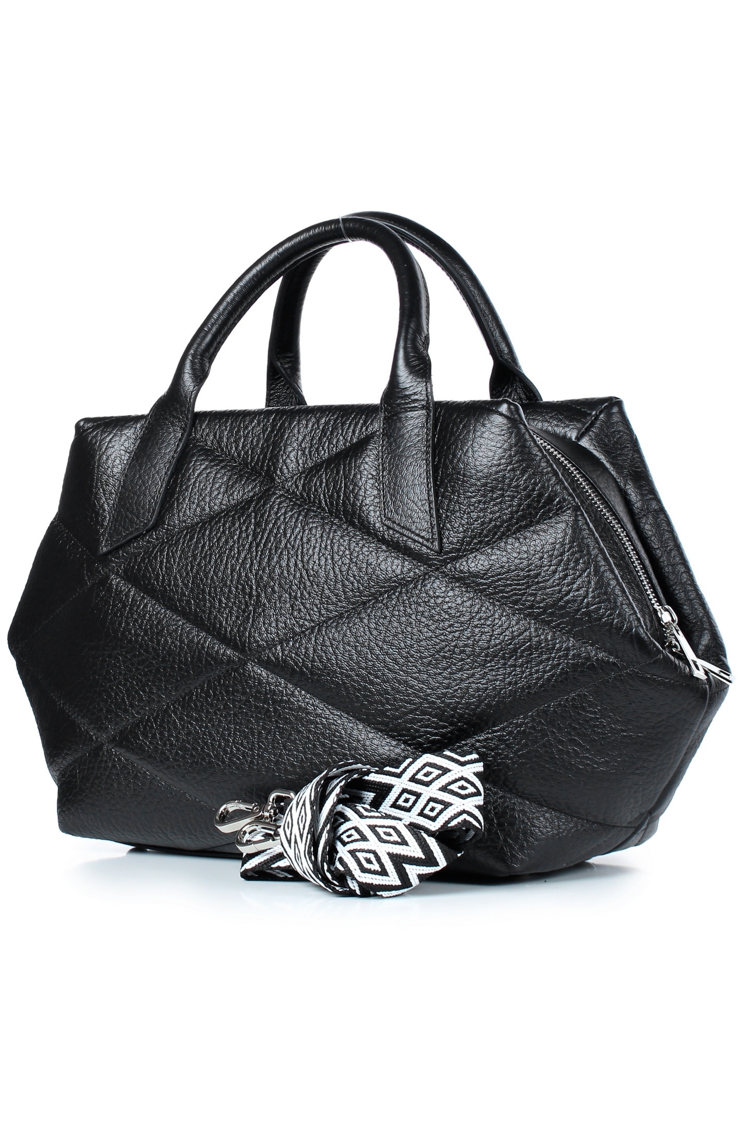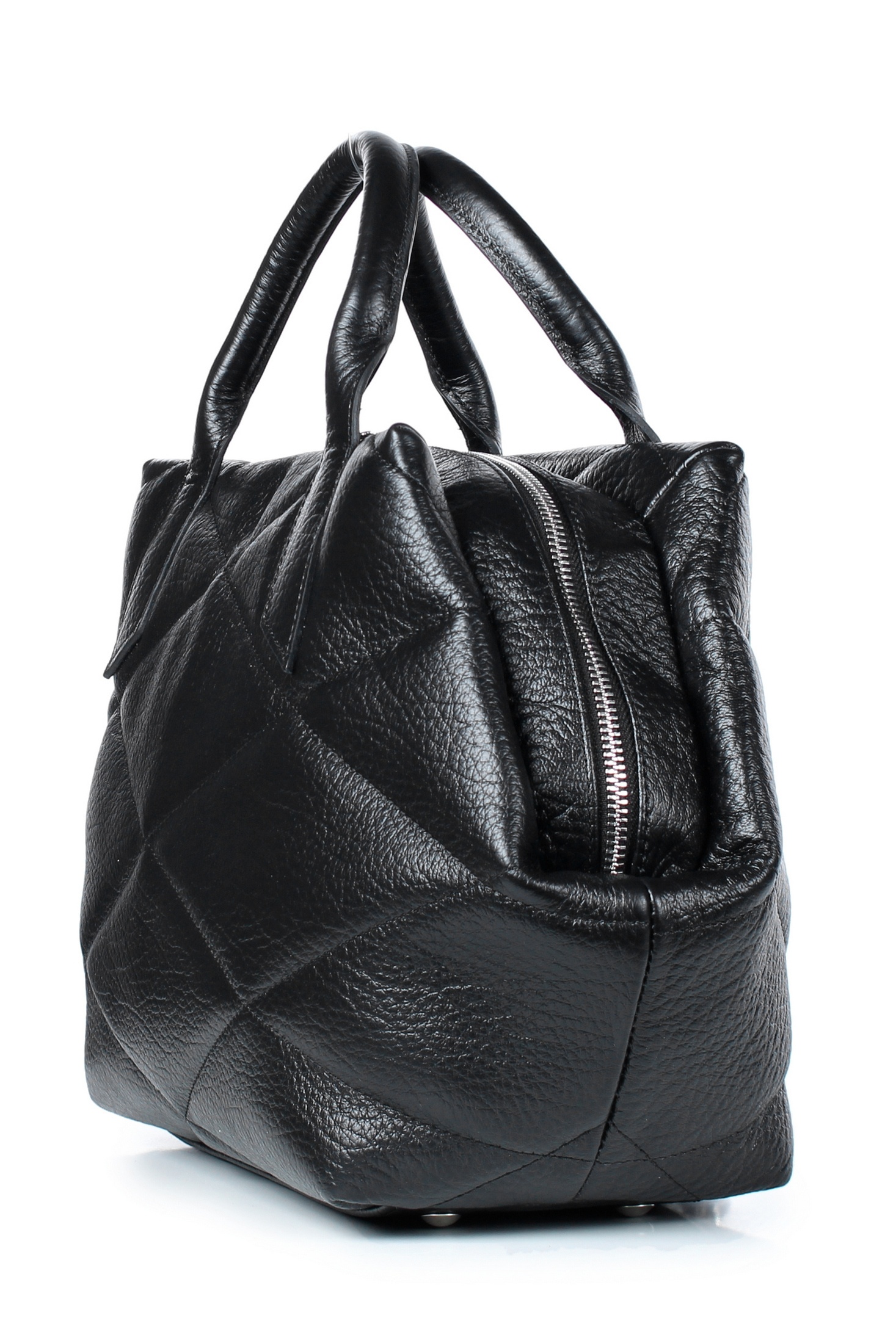 Сумка на одно отделение, закрывающееся на застежку-молнию, с двумя ручками длиной 310+-10 мм, со съемной нерегулиющейся ручкой-ремнем длиной 960+-10 мм, с декоративной растрочкой стенок, с пуклями на дне. Цвет фурнитуры - никель. Сумка на подкладке, с открытым карманом с украшением, с подвесным карманом, закрывающимся на застежку-молнию, с декоративной накладкой на кармане, с футляром для пластиковых карт.