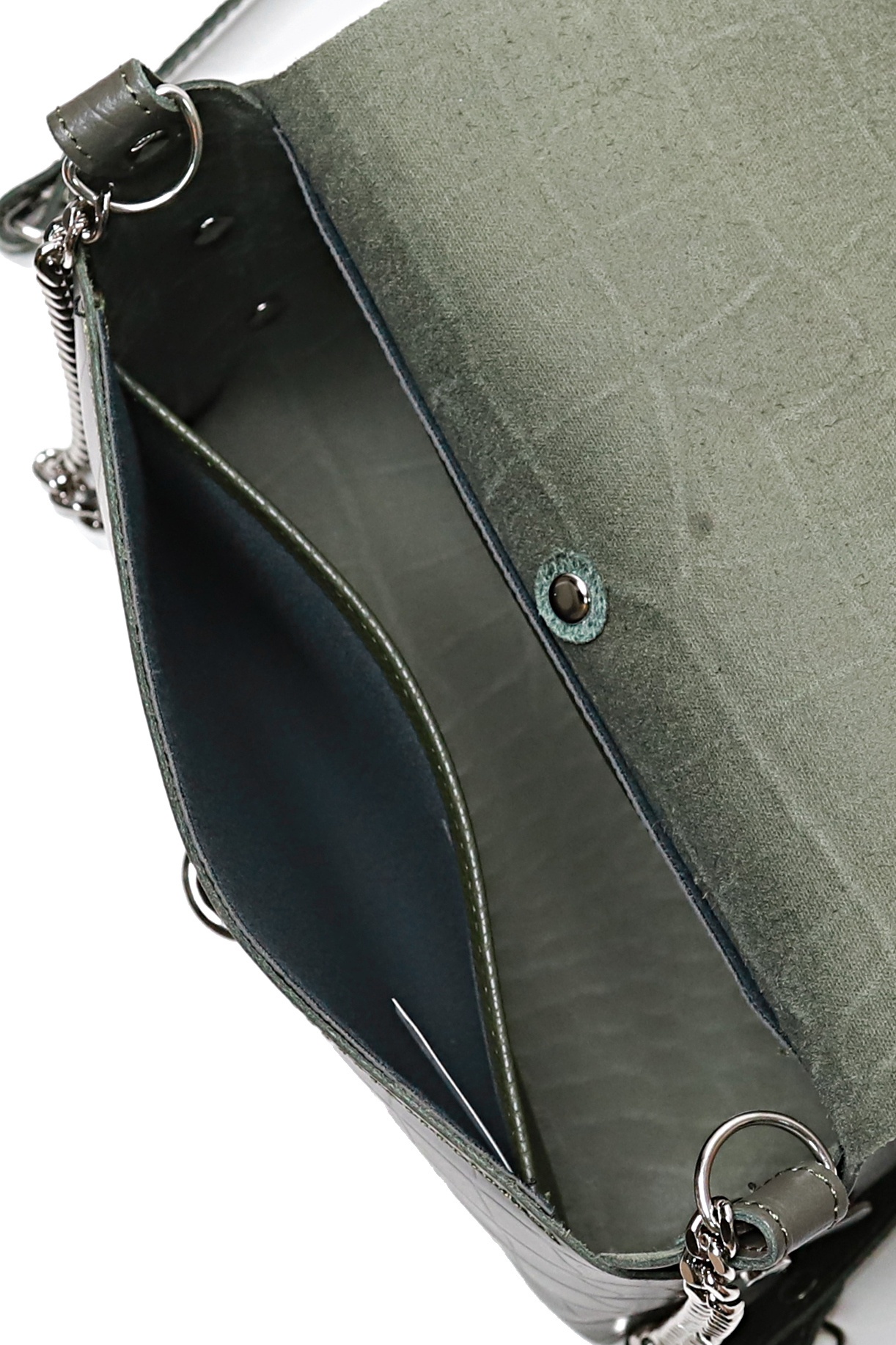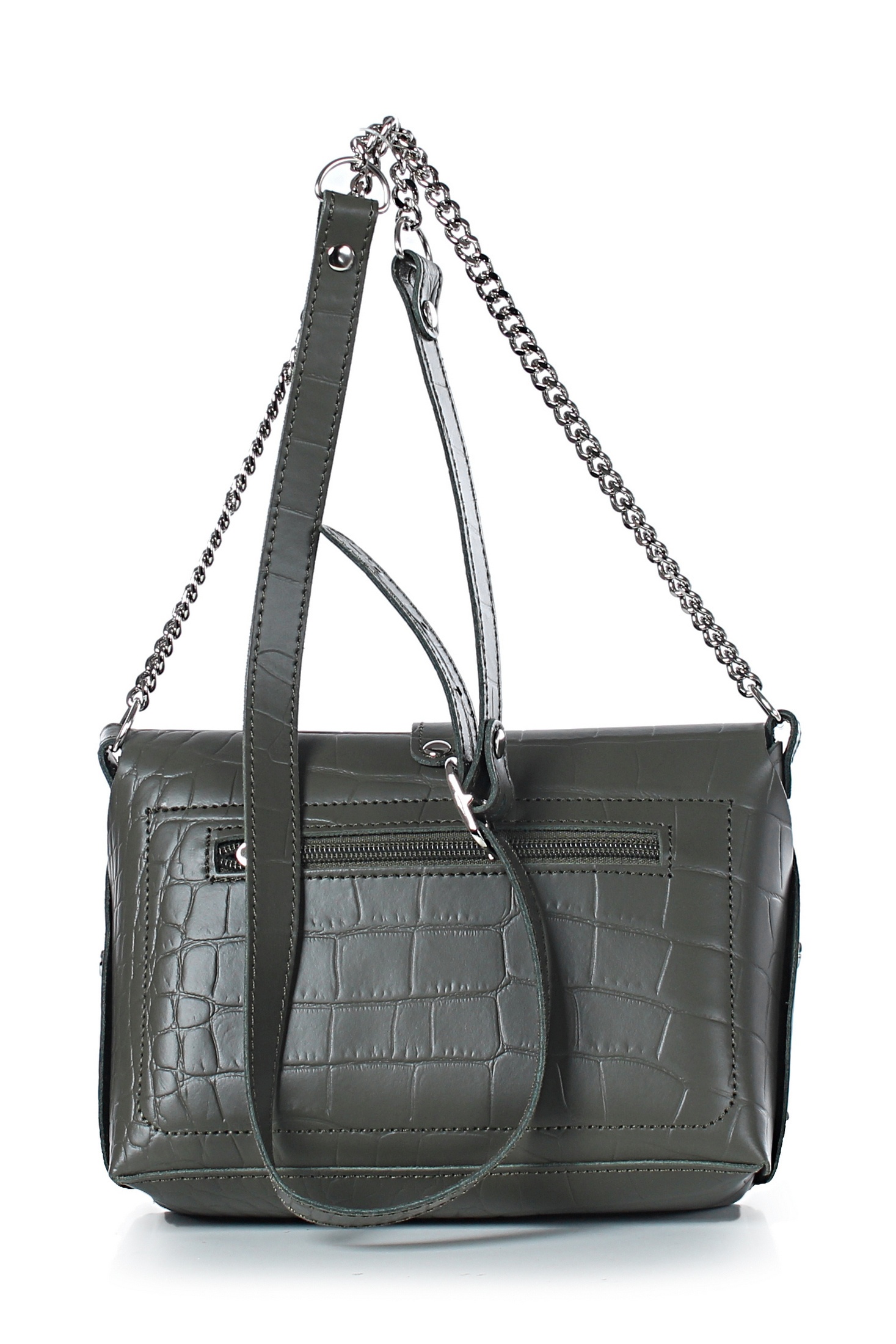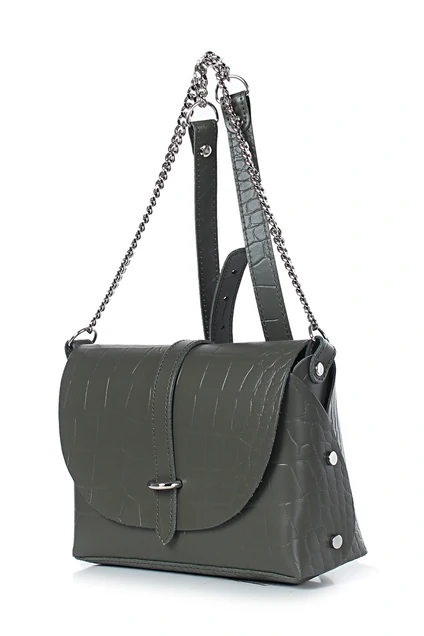 Сумка закрывается клапаном и цупфером через полукольцо, с краями в обрезку, без обработки краев, с заклепками с боковых сторон, на задней стенке карман, закрывающийся на застежку-молнию, с декоративной строчкой на задней стенке, с ручкой-ремнем, который частично состоит из цепи, с боковыми ручкодержателями. Сумка без подкладки, с подвесным карманом.