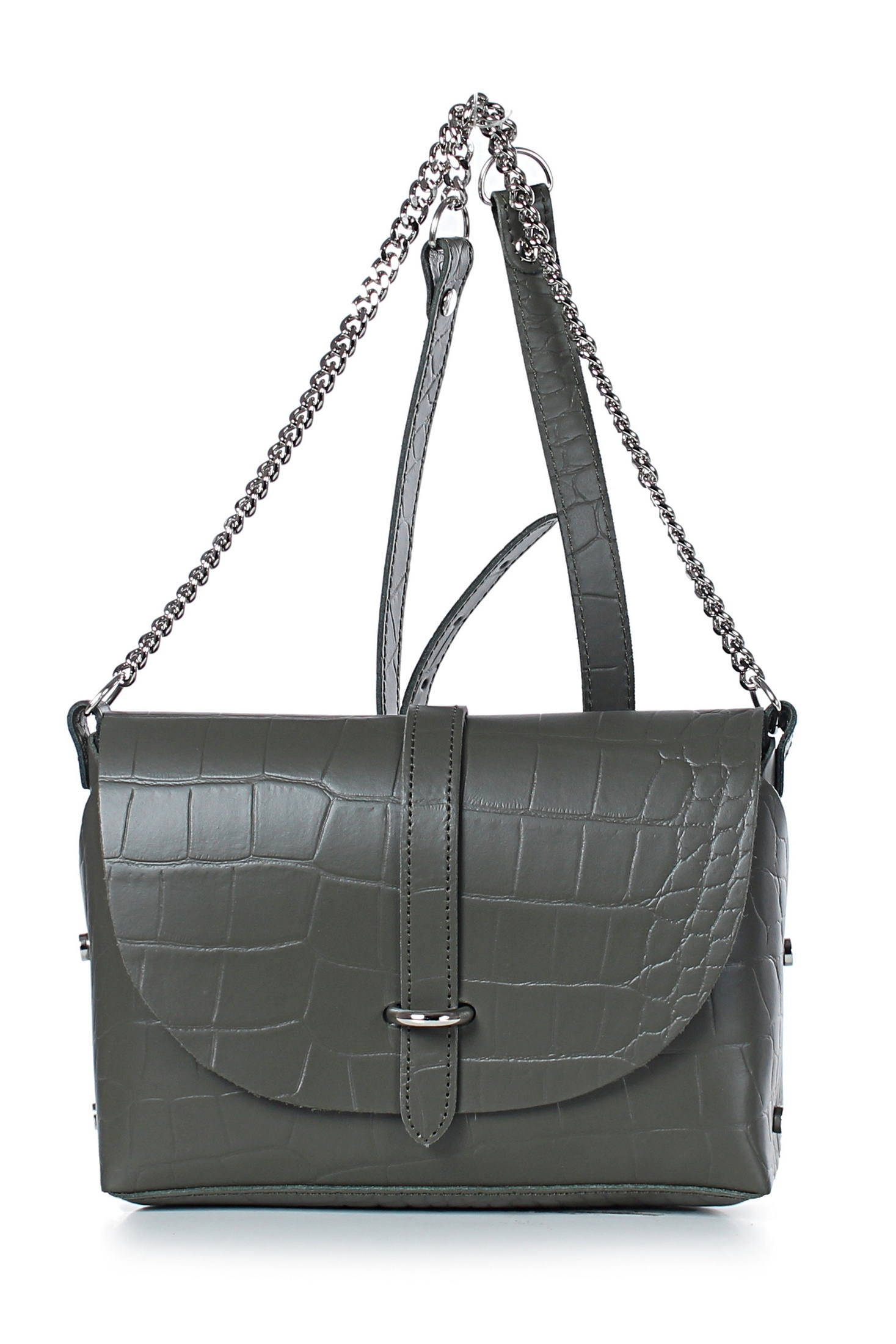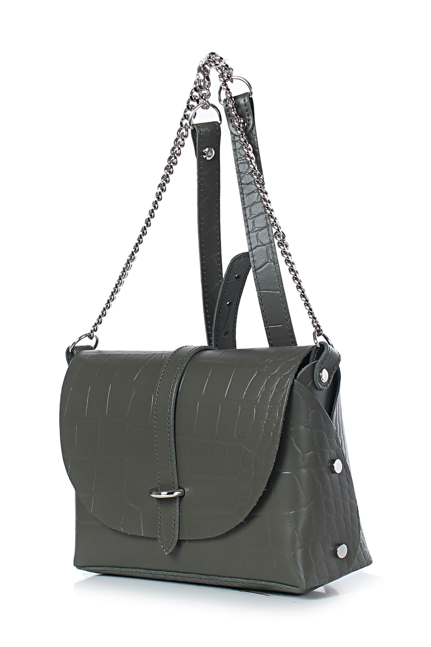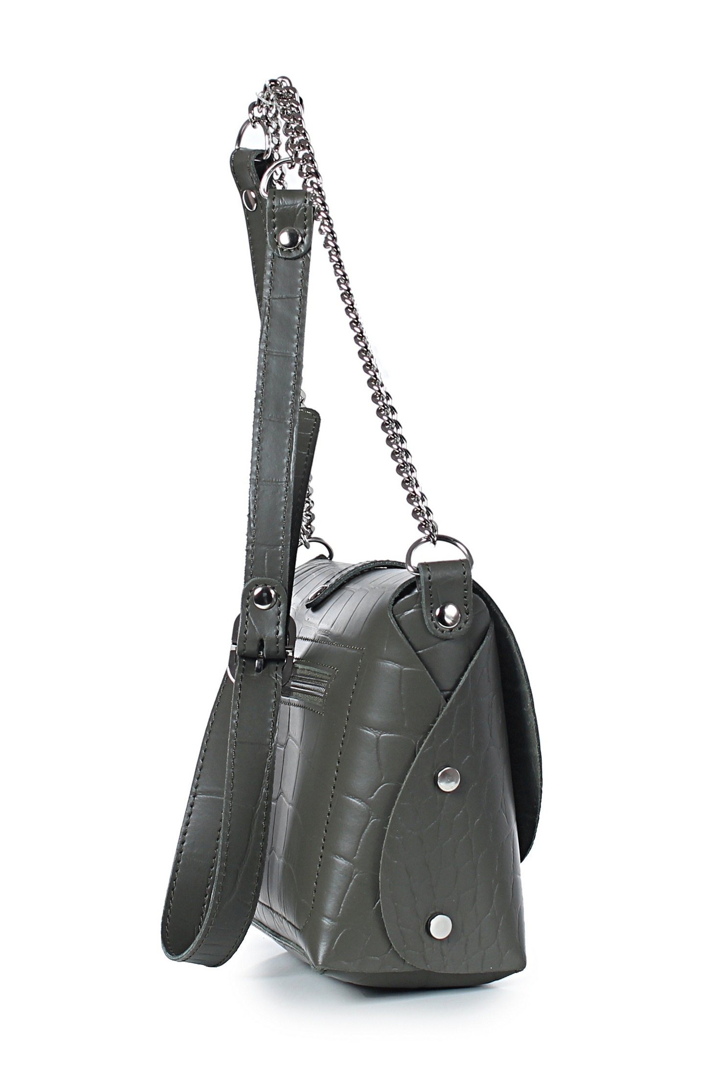 Сумка закрывается клапаном и цупфером через полукольцо, с краями в обрезку, без обработки краев, с заклепками с боковых сторон, на задней стенке карман, закрывающийся на застежку-молнию, с декоративной строчкой на задней стенке, с ручкой-ремнем, который частично состоит из цепи, с боковыми ручкодержателями. Сумка без подкладки, с подвесным карманом.
