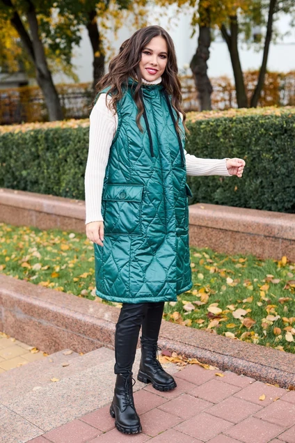 Жилет длиной ниже колена, выполнен из стеганой на синтепон плащевки. В качестве отделки использована контрастная по цвету плащевка без стежки. Жилет на подкладке. Полочка жилета с вертикальными рельефами, центральной застежкой на скрытую молнию. Полочка с накладными карманами и клапанами с застежкой на петлю и пуговицу. Спинка цельная. Горловина круглой формы, обработана капюшоном с кулисой, через которую протянут шнур. По центру капюшона по переду обработана застежка Velcro. По низу жилета обработана кулиса с резинкой и фиксаторами.