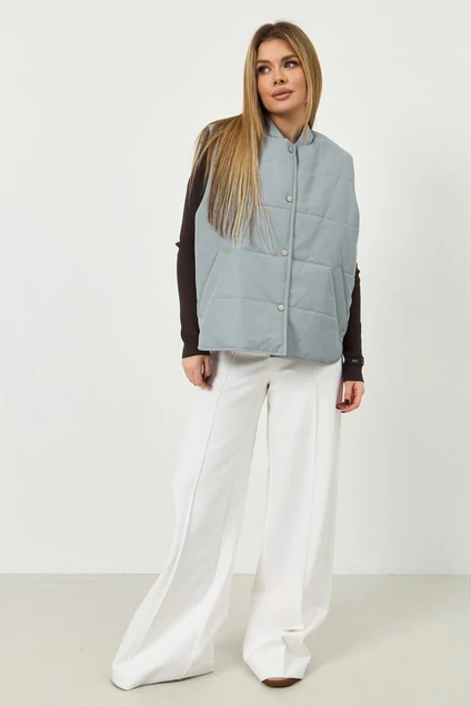 Жилет стеганый, прямого свободного кроя. По переду застежка на кнопки. По бокам функциональные карманы. Воротник-стойка. Длина по спинке 67
