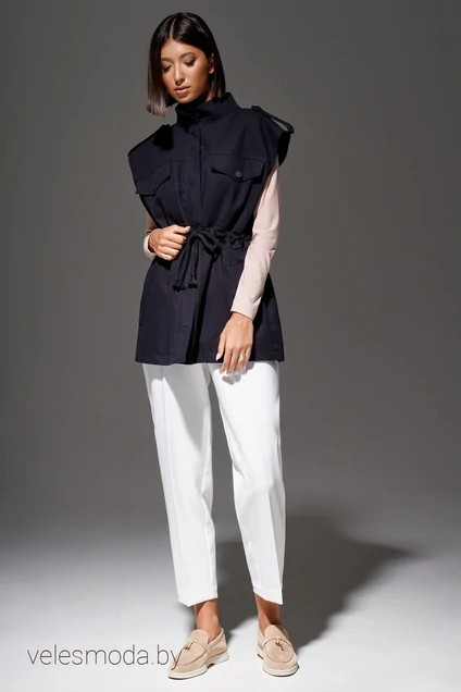 Жилет женский прямого кроя. Воротник стойка. Широкая пройма рукава. Застежка молния, скрытая планкой с пуговичками. По линии талии кулиска. По переду нашиты крупные карманы. По бокам прорезные карманы. Спинка отрезная . На плечи нашиты паты. Длина изделия 75.