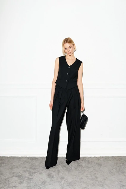 Жилет прямого свободного кроя выполнен из полотна черного цвета. Стильный жилет идеально подчеркнёт Ваш индивидуальный деловой образ.Характеристики однобортный, прямой крой, подкладка, остроугольные лацканы, прорезные карманы обманки, застежка центральная на петли - пуговицы, низ изделия по переду с фигурным низом. Длина по спинке 43 см.