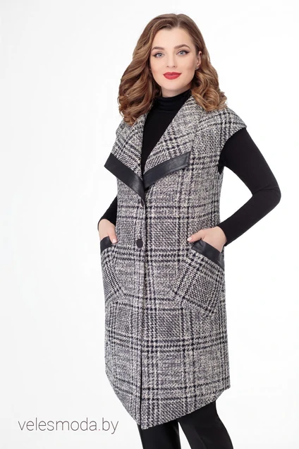 Жилет женский, полуприлегающего силуэта, с воротником шалевого типа, со спущенным плечом, с накладными карманами, с застёжкой на одну прорезную петлю и пуговицу. Жилет длиной выше уровня линии коленей, с притачной подкладкой до уровня линии талии.