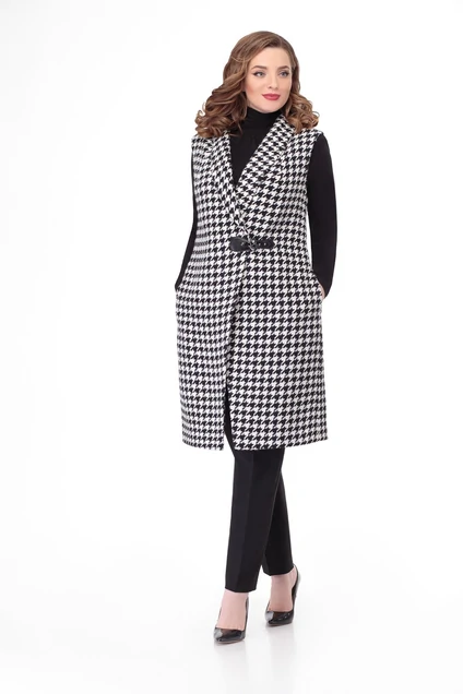 Жилет женский, полуприлегающего силуэта, с воротником шалевого типа, с нагрудными вытачками, идущими от горловины, с карманами в боковых швах, с застёжкой на декоративную пряжку, со скошенными краями бортов. Спинка со средним швом, со шлицей. Жилет длиной выше уровня линии коленей, с притачной подкладкой.