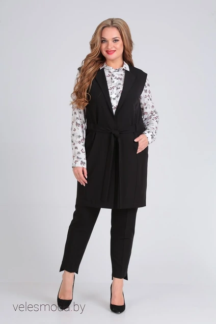 Жилет женский прямого силуэта, застѐгивающийся на одну потайную кнопку. В рельефных швах карманы. По талии съѐмный пояс. Длина изделия по спинке 92 см