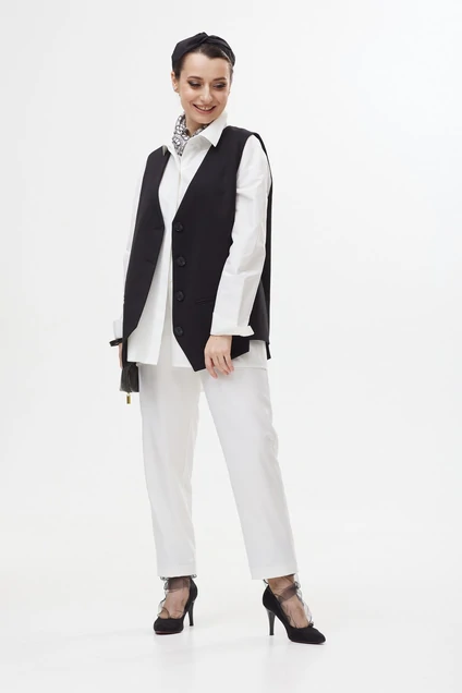 Жилет прямого силуэта с открытой застежкой на 4 прорезные петли и 4 пуговицы. Перед с прорезными карманами в рамку и фигурной линией низа. Отрезной бочок с перепадом длин между бочком и передом/спинкой. Спинка со средним швом, заканчивающийся шлицей. Жилет на подкладке. Жилет сшит из костюмной ткани.