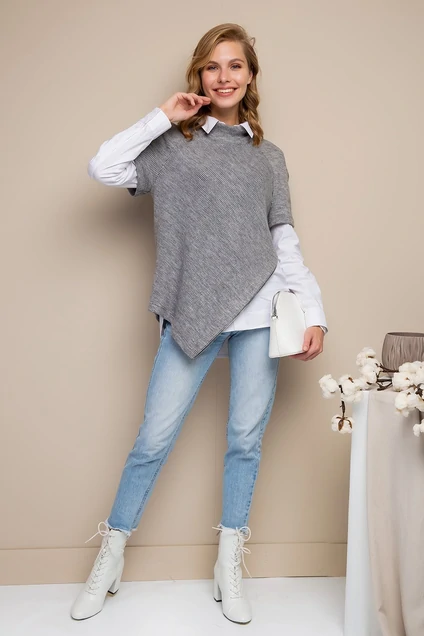 Жилетка из вязаного трикотажа с асимметричным низом и коротким рукавом-регланом. Горловина оформлена мягкой стойкой. Косой срез жилетки декорирован металлической молнией. Мы рекомендуем сочетать жилетку с рубашкой, платьем или водолазкой