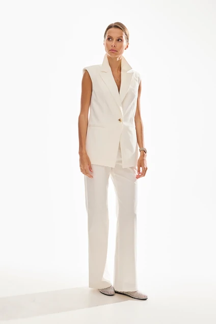 Жилет женский полуприлегающего силуэта , выполненный из хлопковой ткани высокого качества . Жилет с центральной застежкой и с четко выраженным плечевым поясом . Воротник стояче - отложной с отворотами лацканов . По переду жилета также функциональные карманы с клапанами . Жилет на хлопковой подкладке.