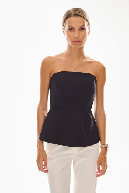 Жилет - бандо , приталенного силуэта , выполнен из хлопкового однотона высокого качества , на хлопковой подкладке . По линии талии подрез , с оригинальной баской . Застежка сзади на потайную молнию . Швы данного изделия уплотнены корсетной летной , для четкого силуэта .