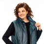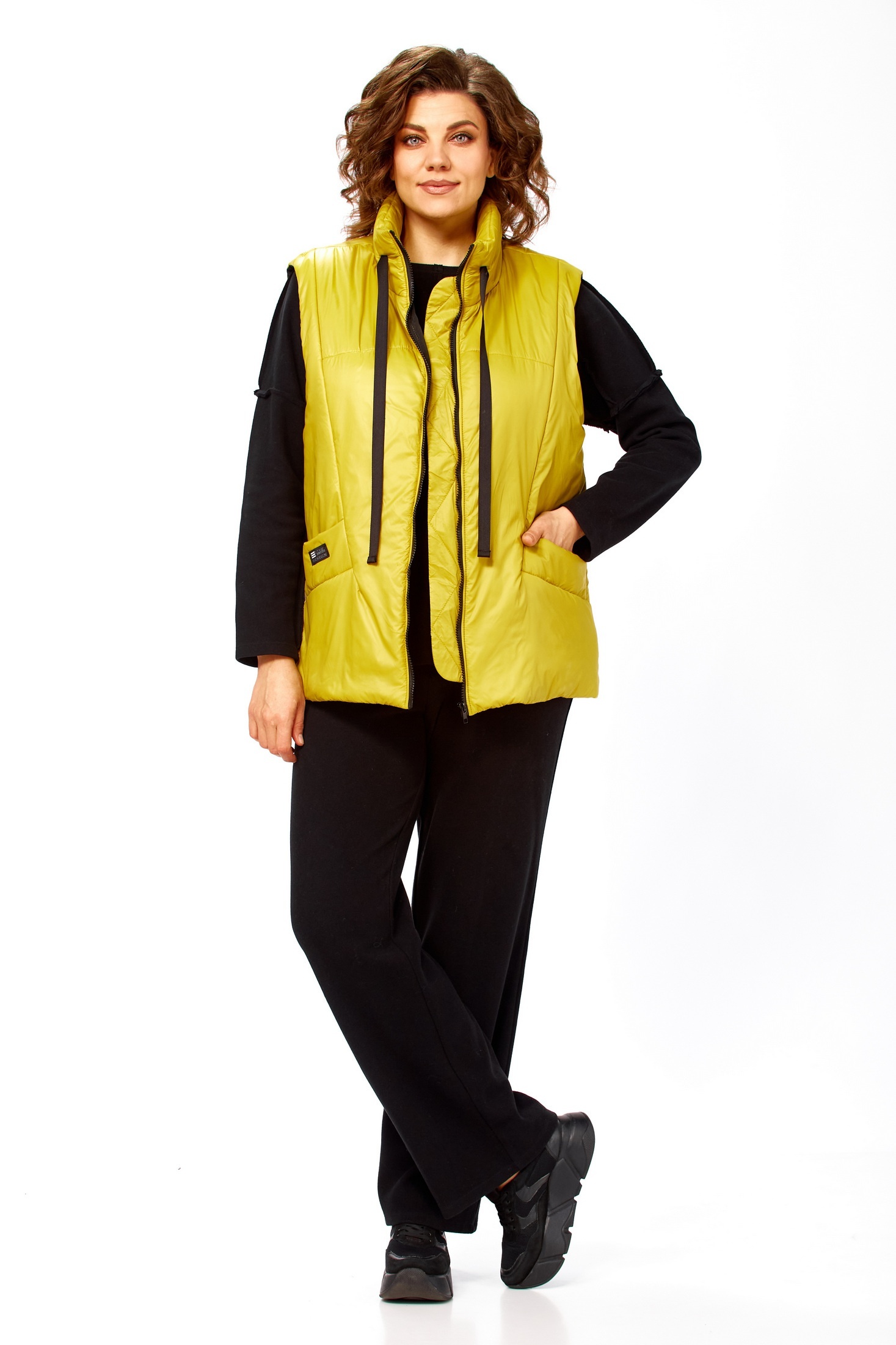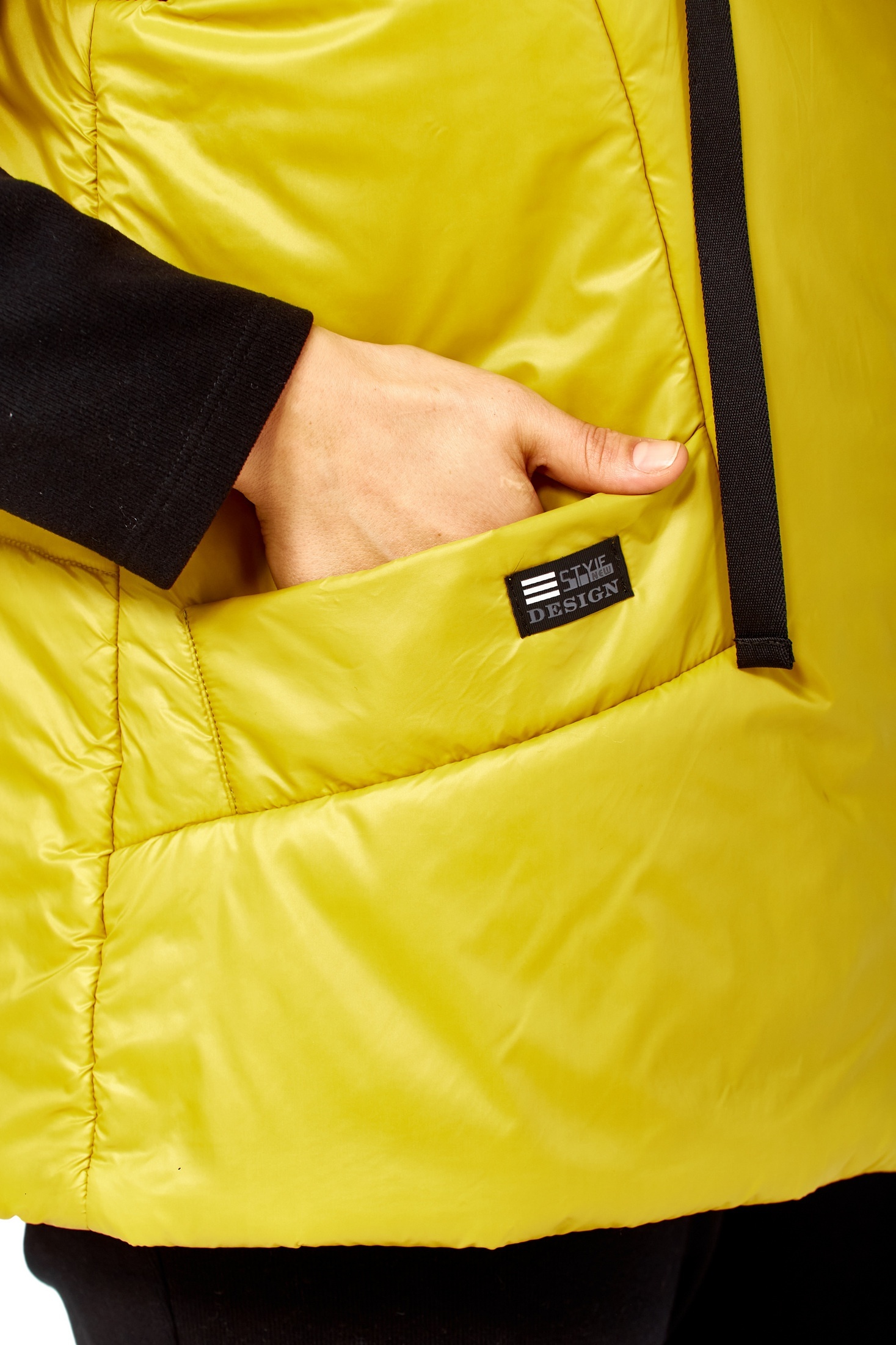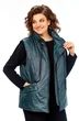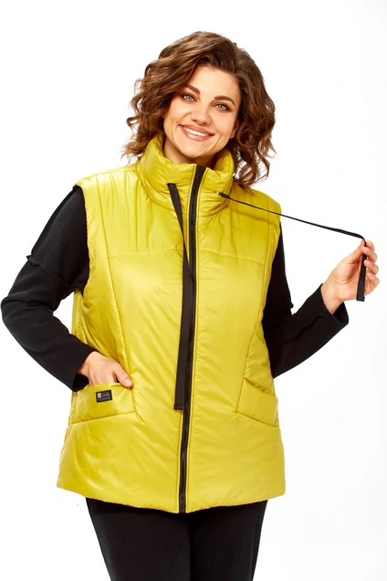 Жилетка женская утепленная с центральной застежкой на "молнию". Спинка со стяжкой. Перед с отрезными бочками и боковыми карманами "с листочкой". Воротник стойка с кулисой и шнуром из декорированной тесьмы. Низ жилетки округлой формы спереди короче, а спинка длиннее . Правый карман украшен нашивкой.