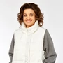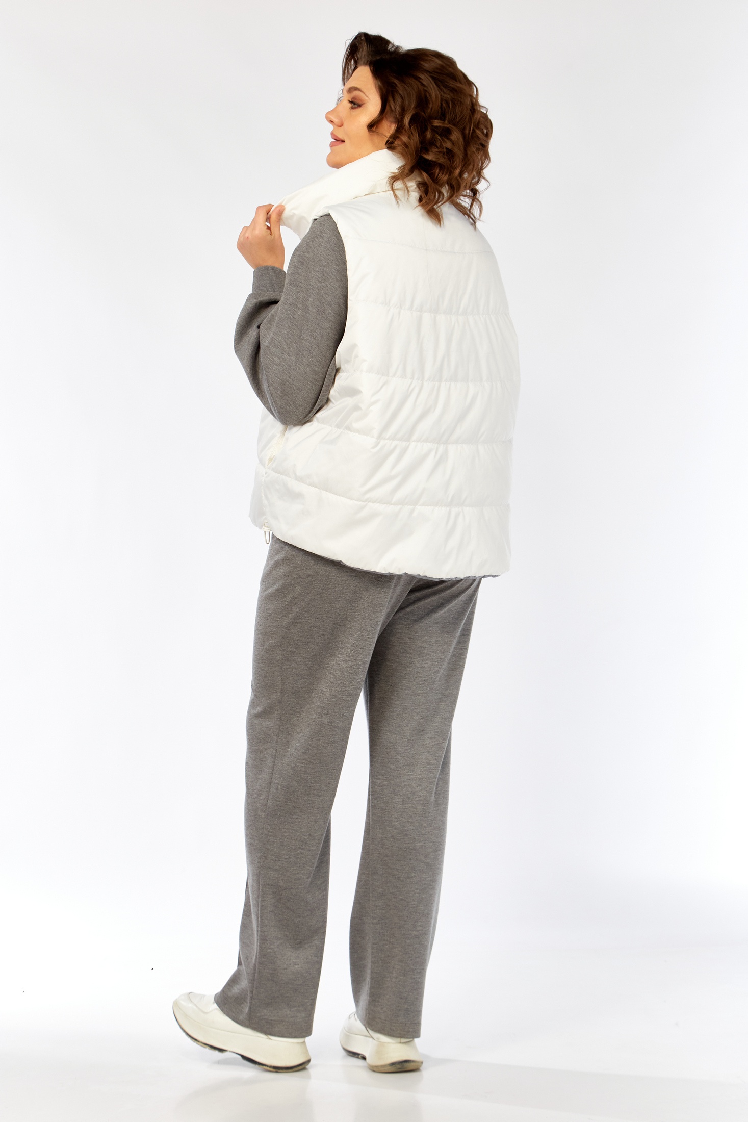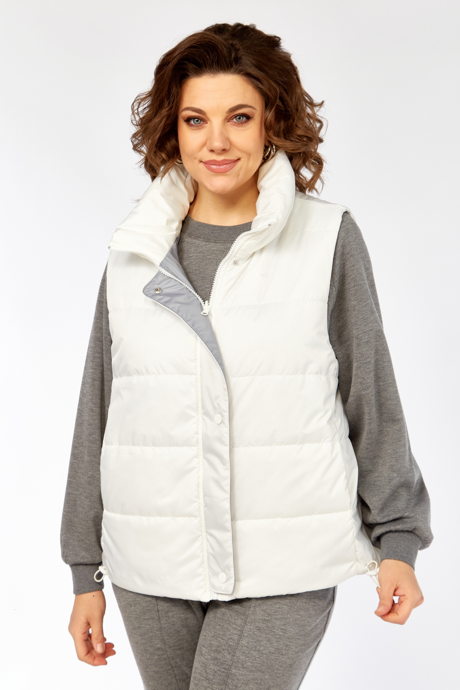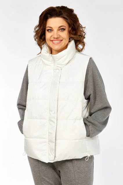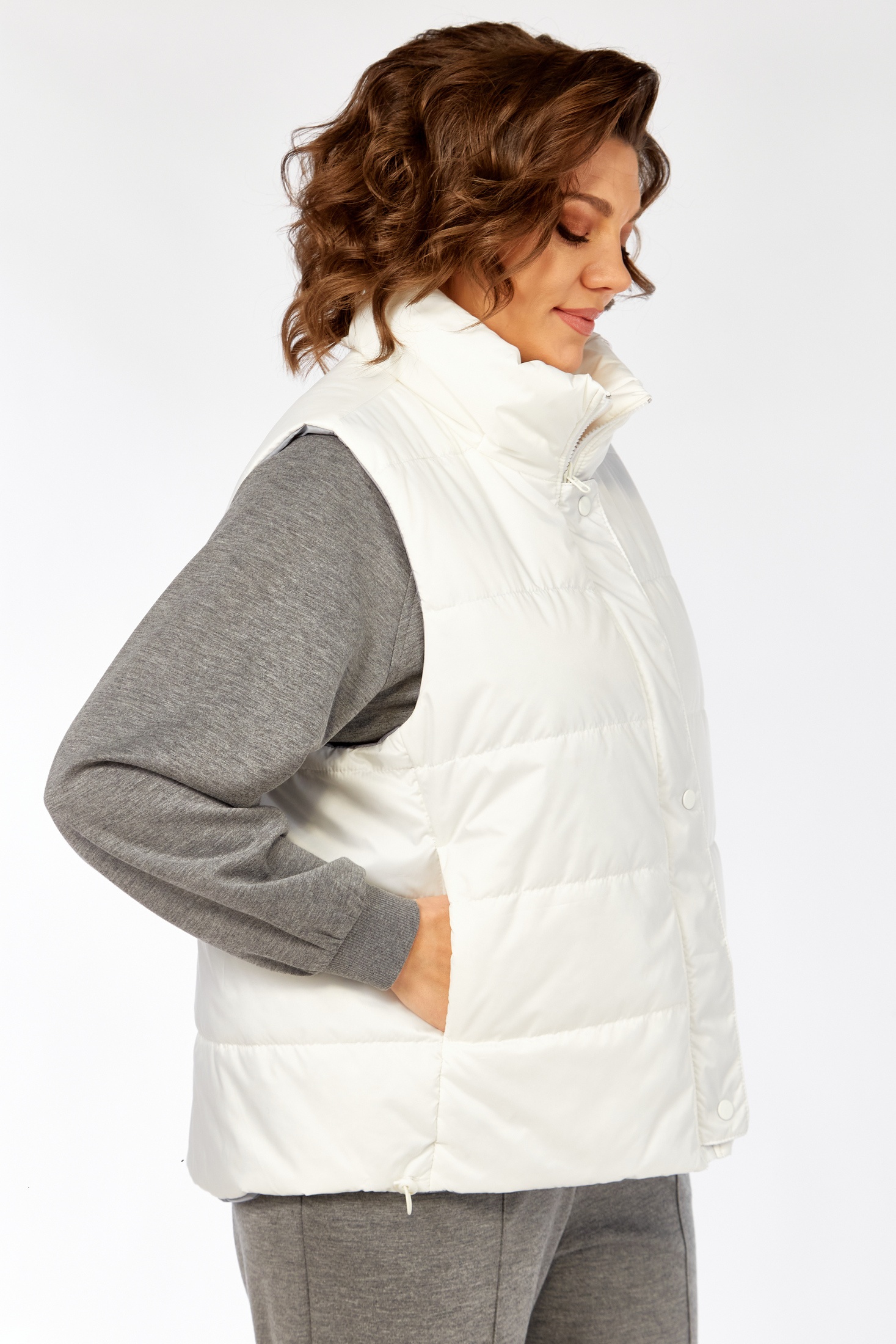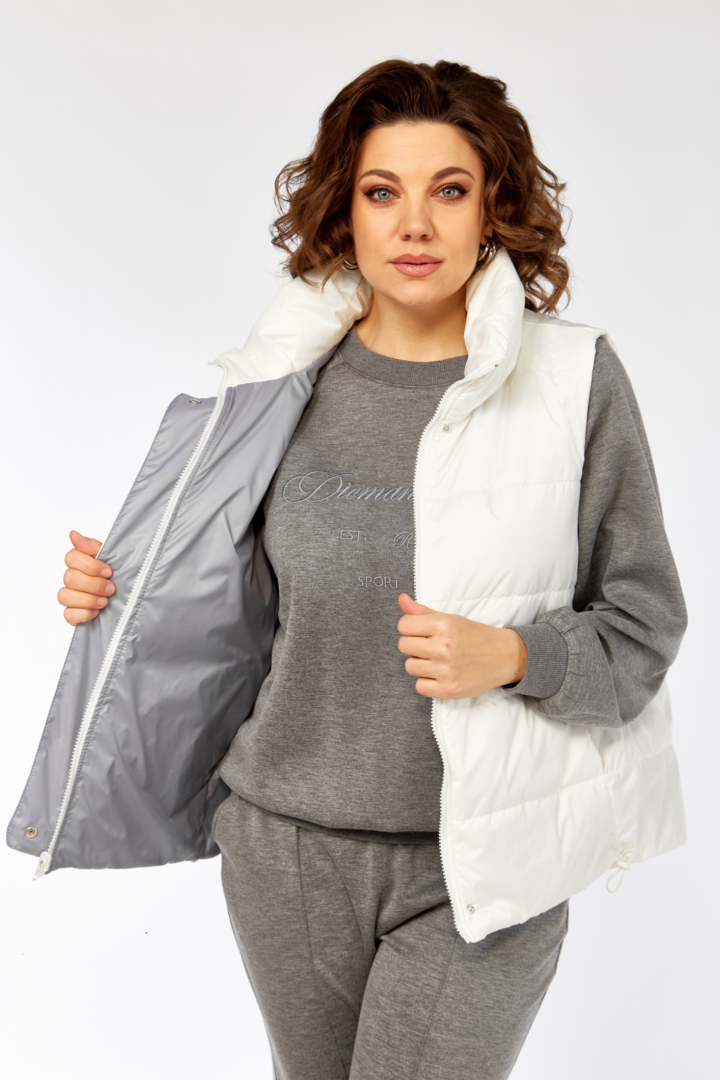 Жилетка женская прямого силуэта с центральной застежкой на тесьму-молнию и отделочную планку на кнопки. Боковой шов смещенный на перед, в шве обработаны карманы. Воротник-стойка со складками по линии горловины. Жилетка двухсторонняя. Температурный режим до +5 градусов. Длина по спинке 68 см.