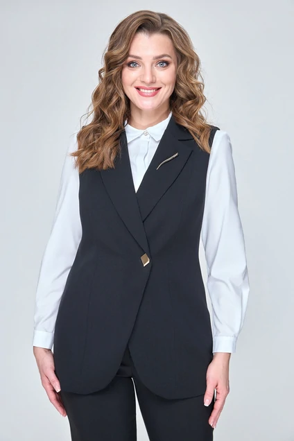 Удлиненный жилет полуприлегающего силуэта, с отложным воротником, на подкладке. Выполнен из костюмной ткани средней плотности. По переду рельефы. По спинке средний шов и рельефы. Застежка на 1 петлю-пуговицу и кнопку. Брошь в комплект не входит
