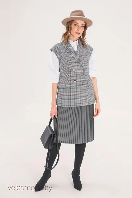 Жилет женский, нарядный, свободного силуэта, из текстильной ткани в клетку. Перед с талиевыми вытачками, прорезными карманами с клапаном, двухбортной застежкой. Спинка разрезная. Вырез горловины офомлен воротником пиджачного типа. Жилет со спущеной линией плеча, на подкладке.