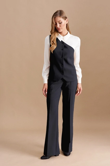 Ассиметричный жилет женский на одно плечо полуприлегающего силуэта из костюмной ткани, на подкладке, с фронтальной застежкой на петли, пуговицы. Перед с имитацией прорезных карманов, нагрудными вытачками. Спинка со средним швом, талиевыми вытачками. Длина изделия выше линии бедер.