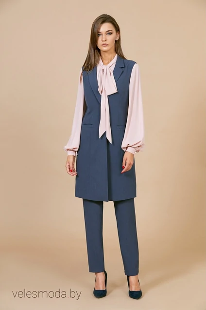 Жилет, полуприлегающего силуэта, притален рельефами, однобортный, с застёжкой на одну пуговицу. Спереди прорезные карманы с листочкой. Жилет на подкладке. Длина жилета: р. 44-48 - 91,5см, р.50-54 - 96,5см.