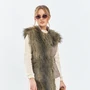 Жилет женский выполнен из сочетания тканей: искусственного меха и джинса, жилет асимметричного кроя. Горловина округлая с небольшим воротником- стойкой. На полочке из денима расположена выточка и пояс с регулировкой объема талии.