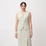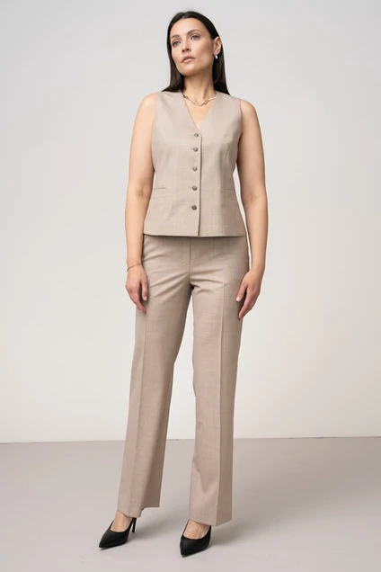 Изящный V-образный вырез и приталенная талия делают силуэт женственным и аккуратным, подчеркивая индивидуальность и деловую уверенность. Жилет застегивается на аккуратную ряд пуговиц спереди, позволяя создать как строгий деловой образ, так и более расслабленный стиль в сочетании с женственными аксессуарами.