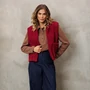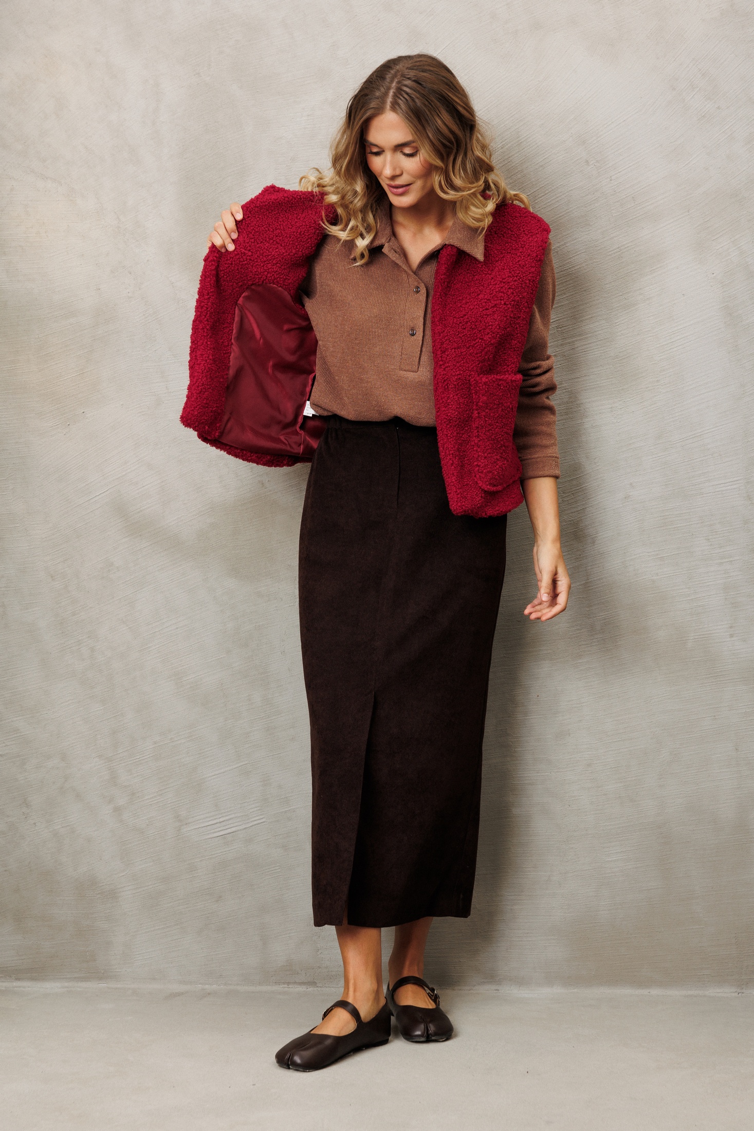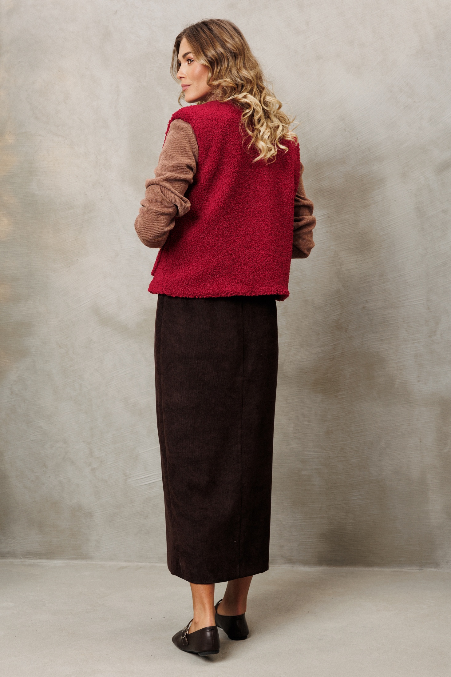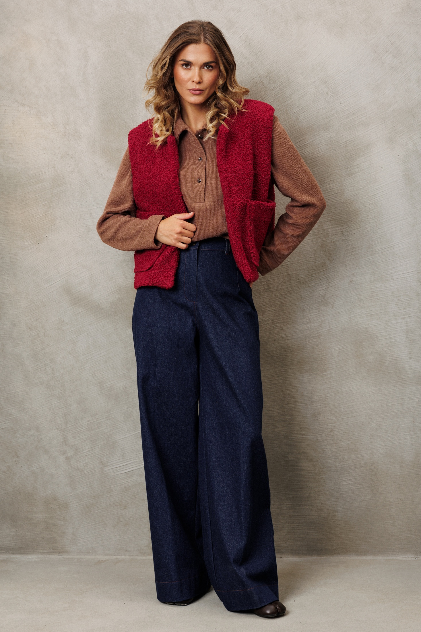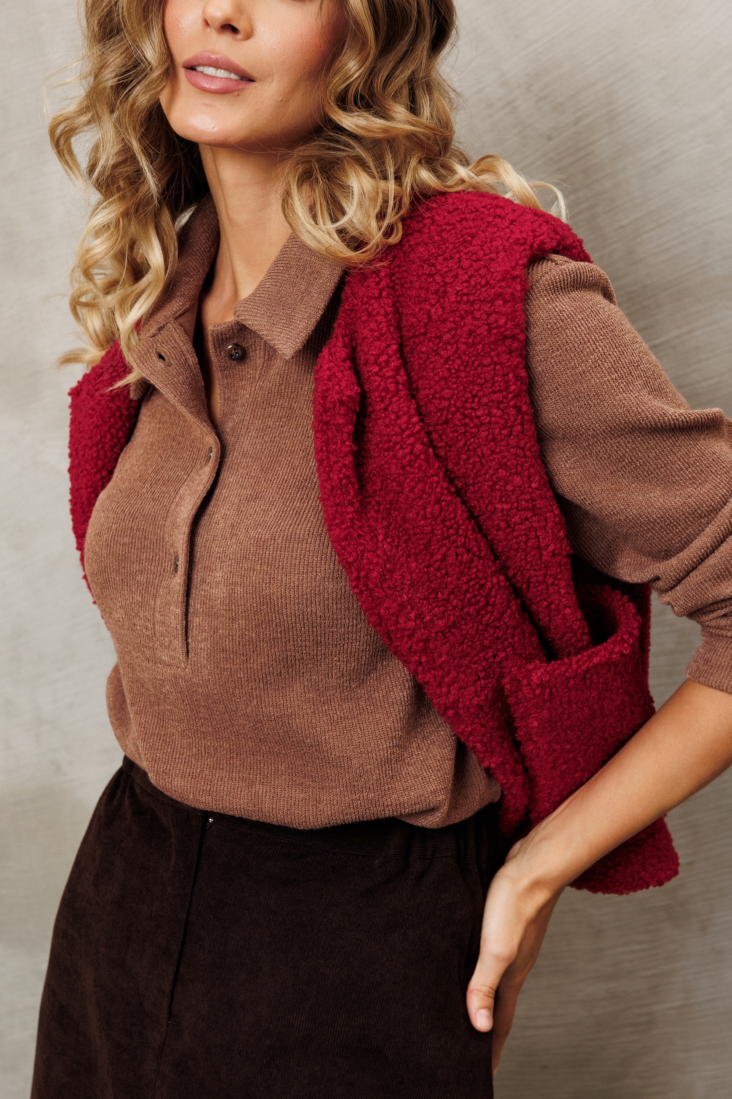 Жилет прямого свободного силуэта из теплой ткани "барашек". Перед с настрочными карманами. Застежка на 3 петли и пуговицы. Жилет на подкладке. Длина жилета - 52 см.