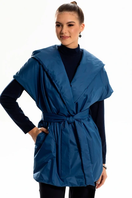Жилет утепленный прямого силуэта в стиле оверсайз, без застежки, со съемным поясом и капюшоном. Полочки и спинка цельные, в боковых швах расположены карманы.