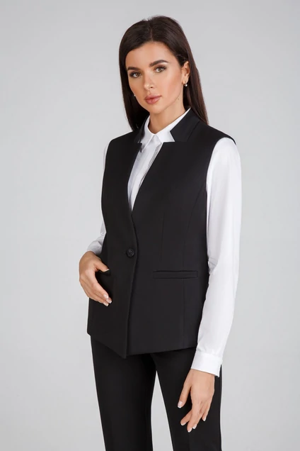 Элегантный однобортный жилет с треугольными вырезами по горловине. Застегивается на пуговицу. Спереди горизонтальные боковые карманы.