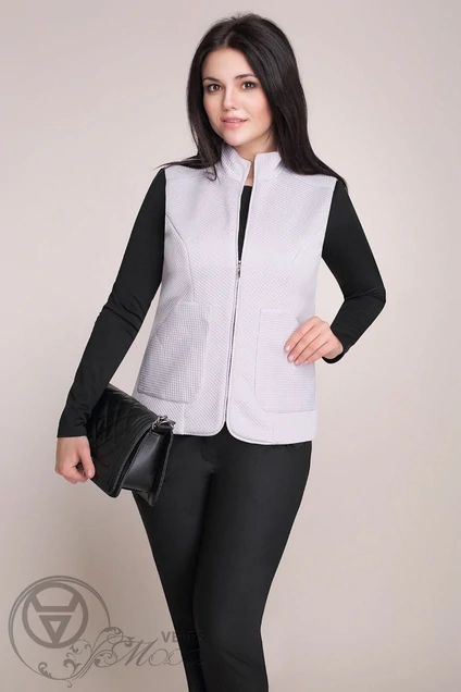 Жилет п/п силуэта с центральной застежкой на молнию. Горловина обработана воротником стойка. Срезы под застежку окантованы. По плечам кокетки. На рельефаз накладные карманы. Спинка со средним швом и рельефами, на подкладке.Длина 59 см.